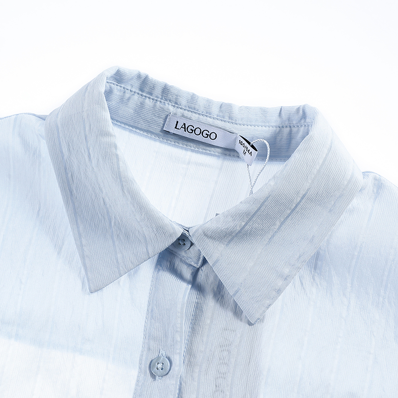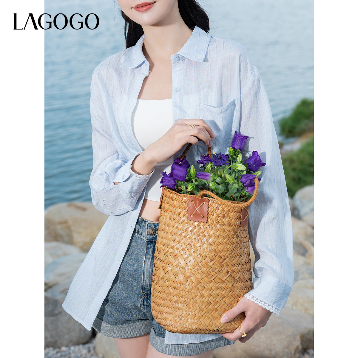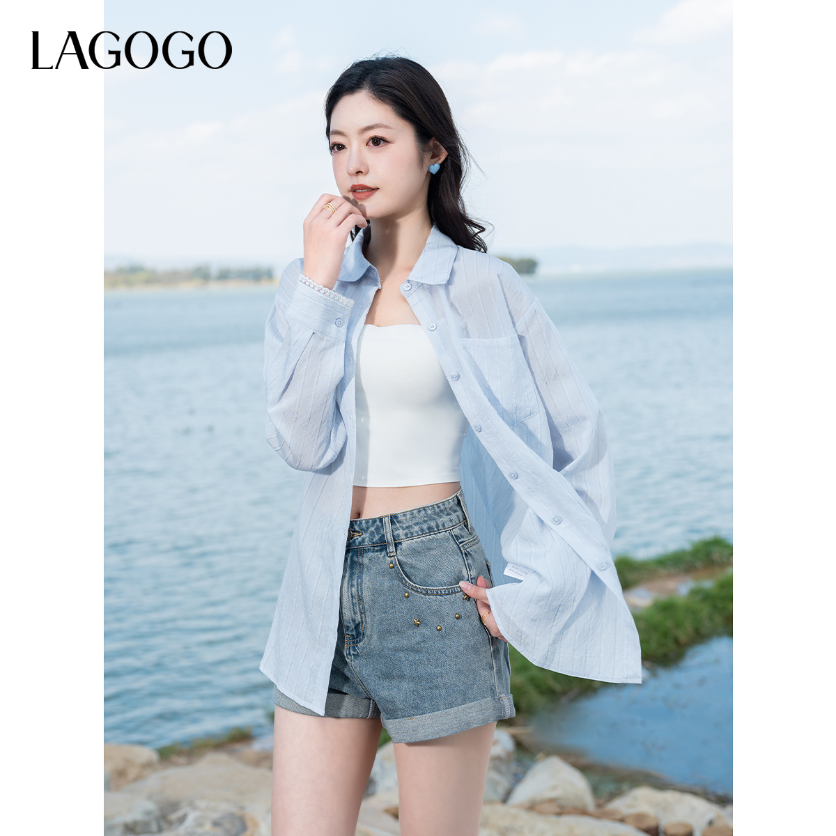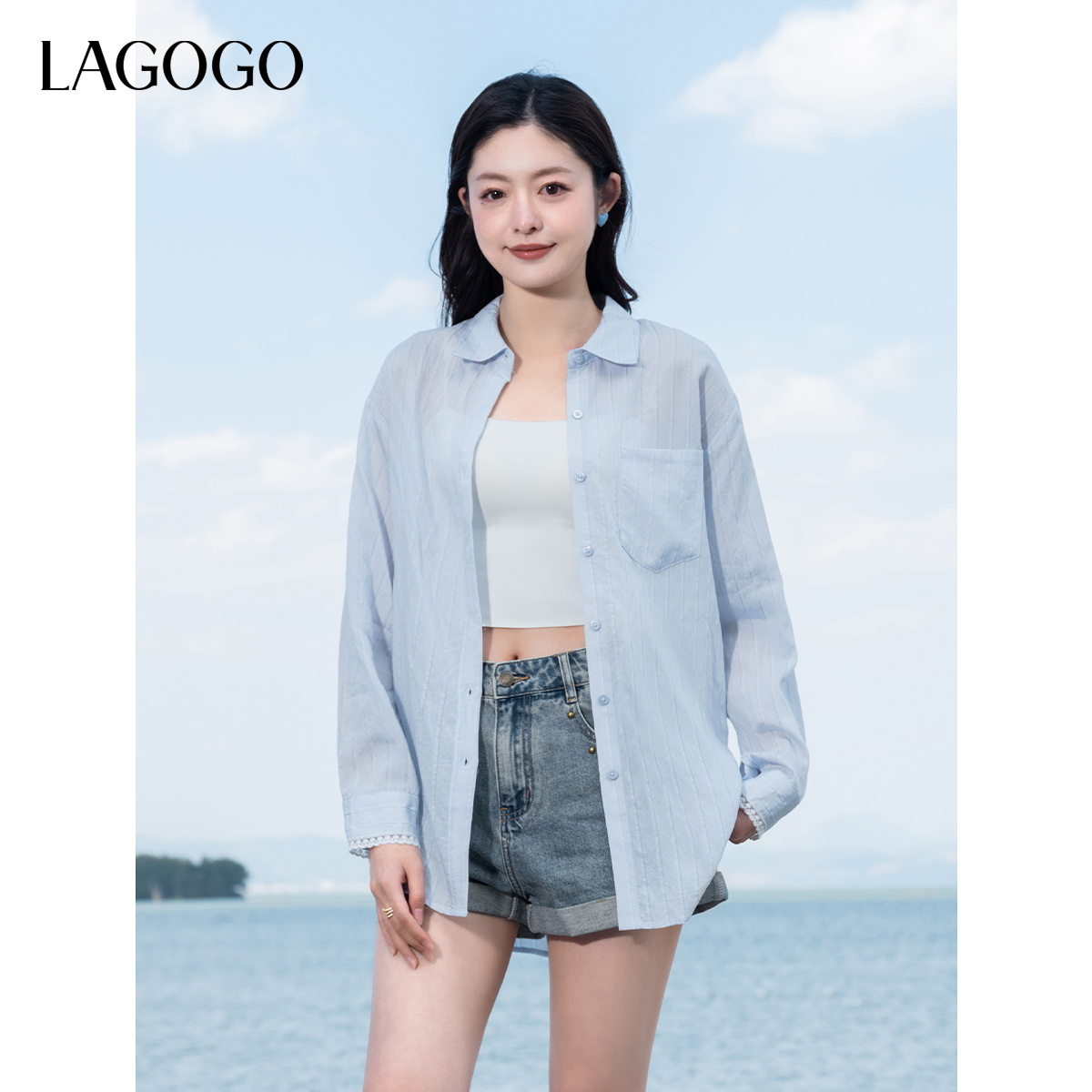 LAGOGO蕾丝拼接蓝色衬衫女拉谷谷2025夏秋季新款轻薄长袖上衣外套