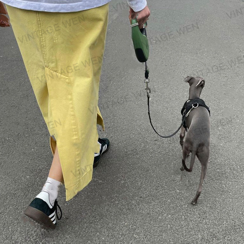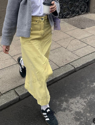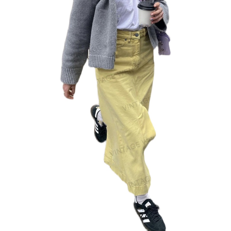 Vintage Wen美式复古浅黄色开叉宽松高腰直筒半身裙女牛仔裙百搭