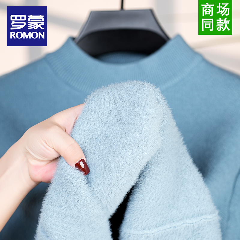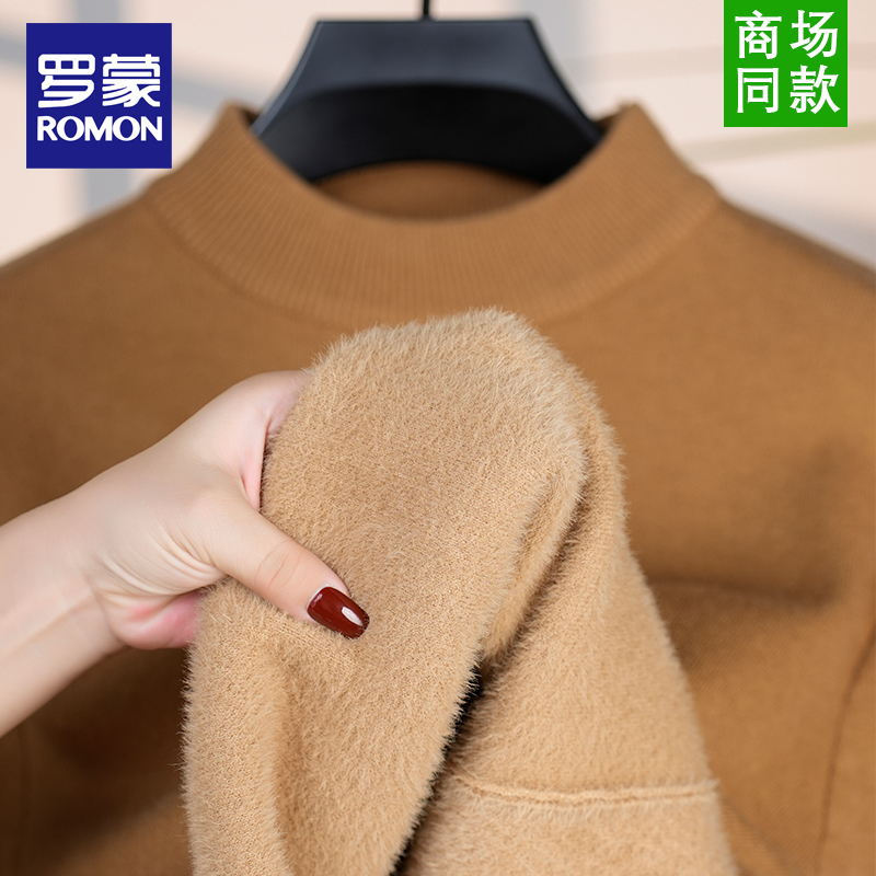 罗蒙一体绒毛衣针织衫男士冬季加绒加厚半高领纯色打底内搭上衣