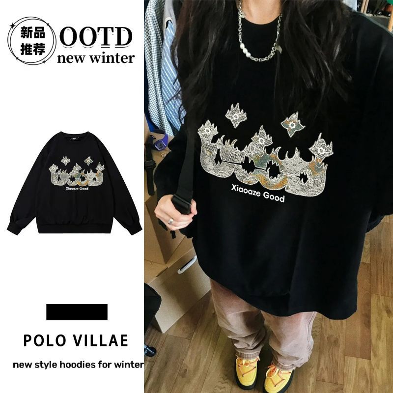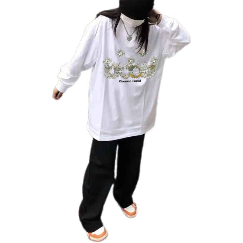 纯棉春秋新款国潮带螺口长袖T恤男女情侣宽松百搭学生上衣打底衫