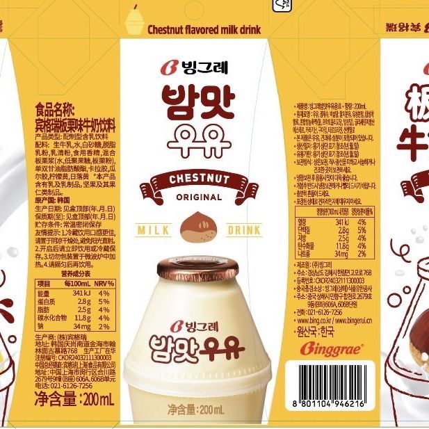 【6盒/24盒】临期韩国进口宾格瑞新风味板栗牛奶200ml早餐调制乳