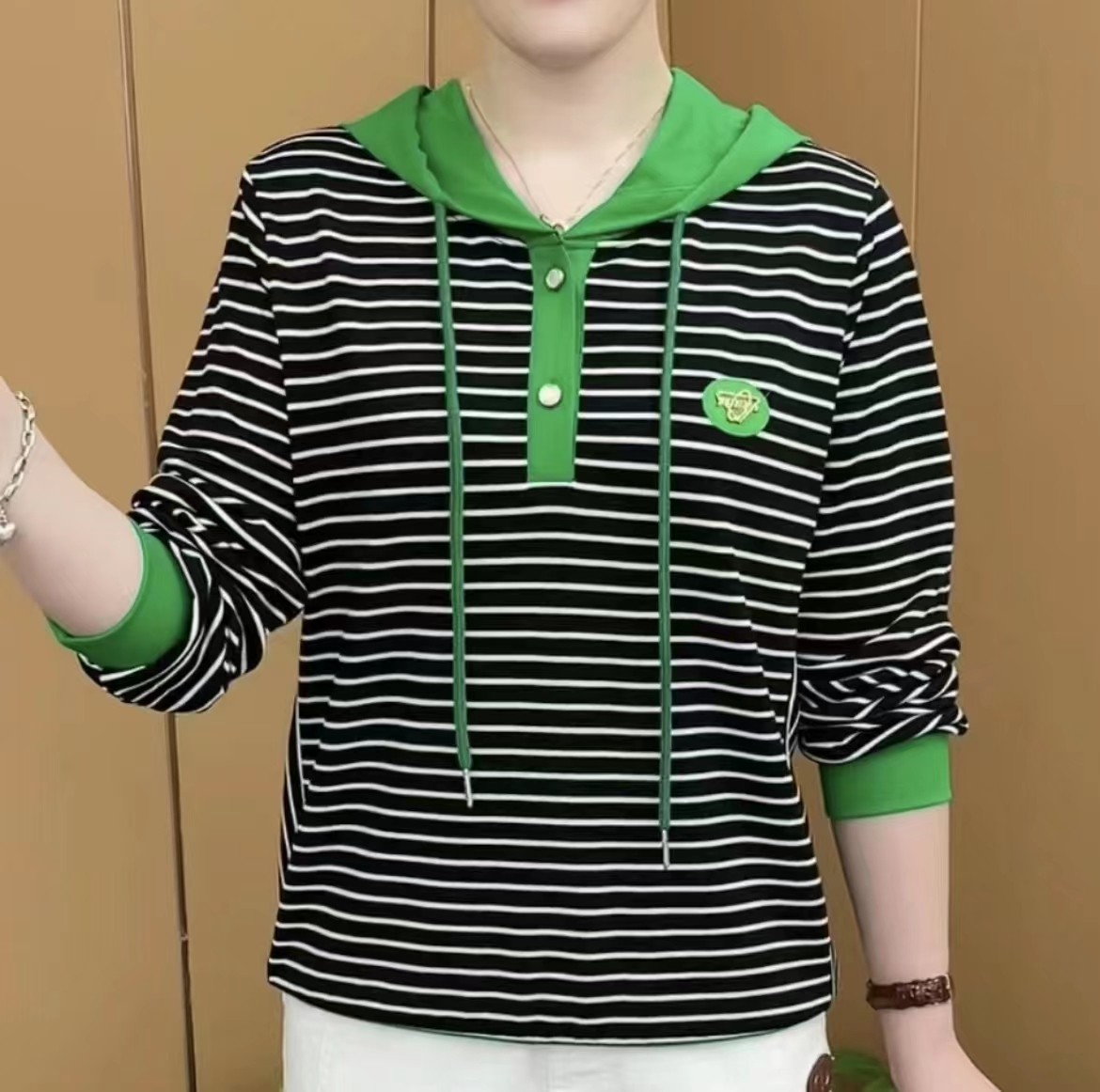 条纹长袖卫衣女春装2023年新款宽松显瘦中年妈妈休闲连帽打底上衣