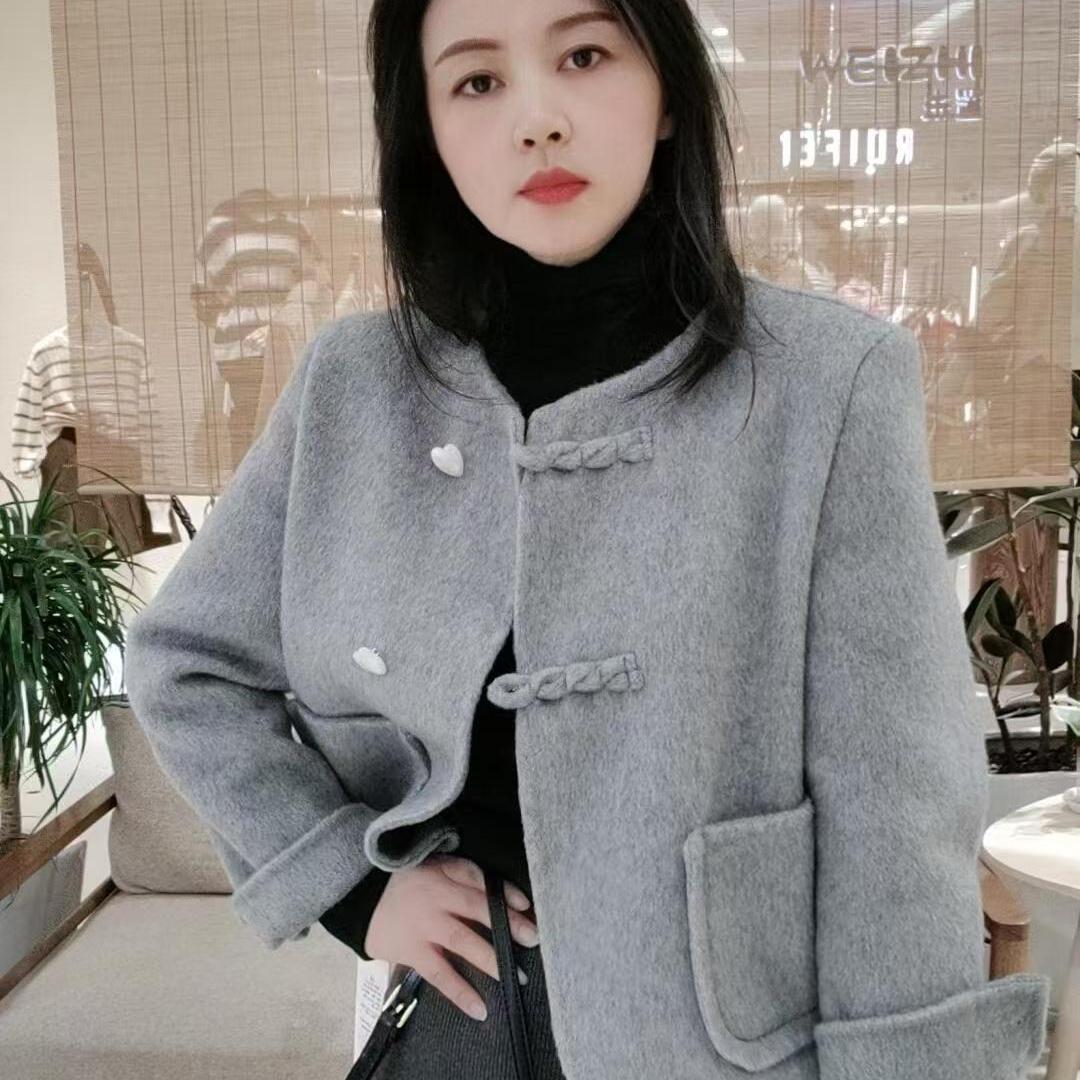 爱心扣小香风双面羊绒大衣女短款2025新款韩版时尚圆领羊毛呢外套