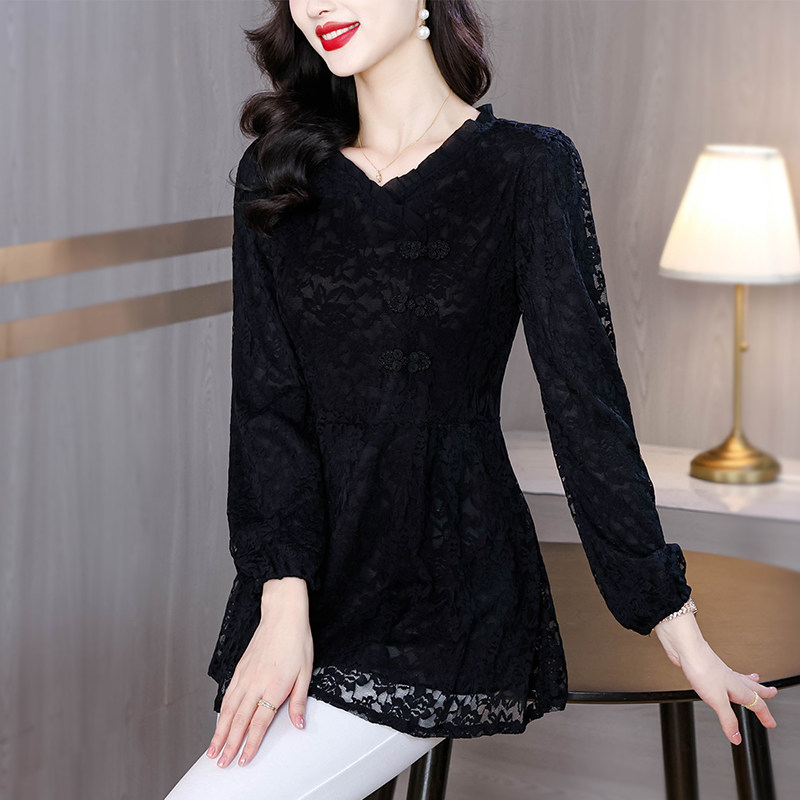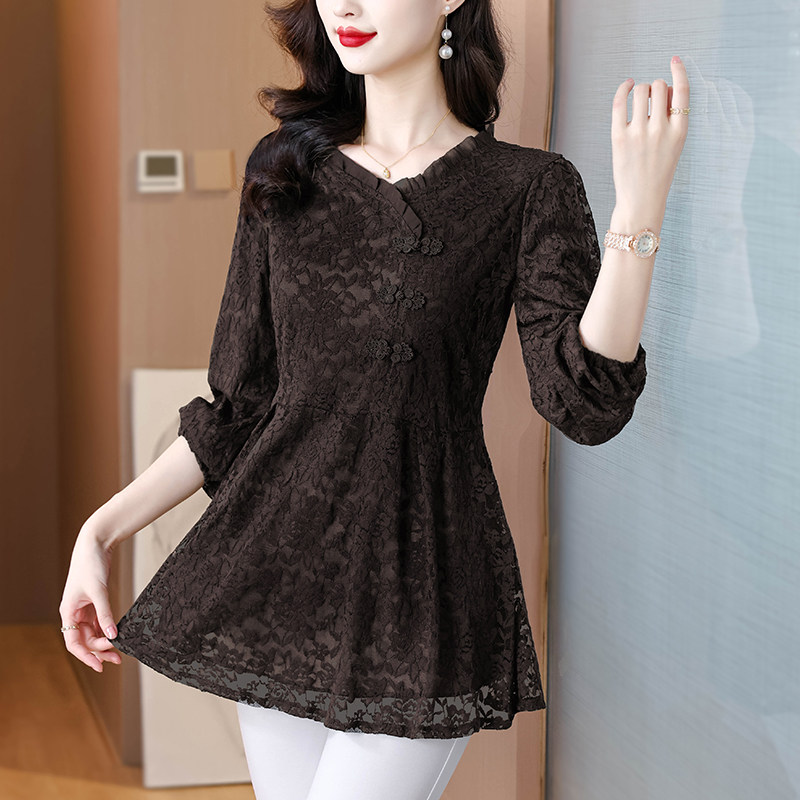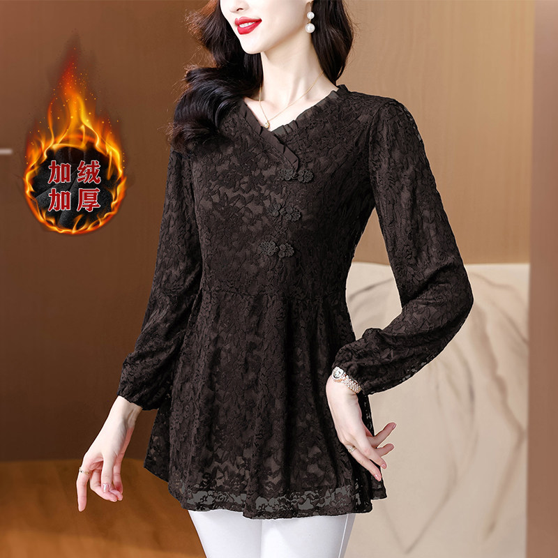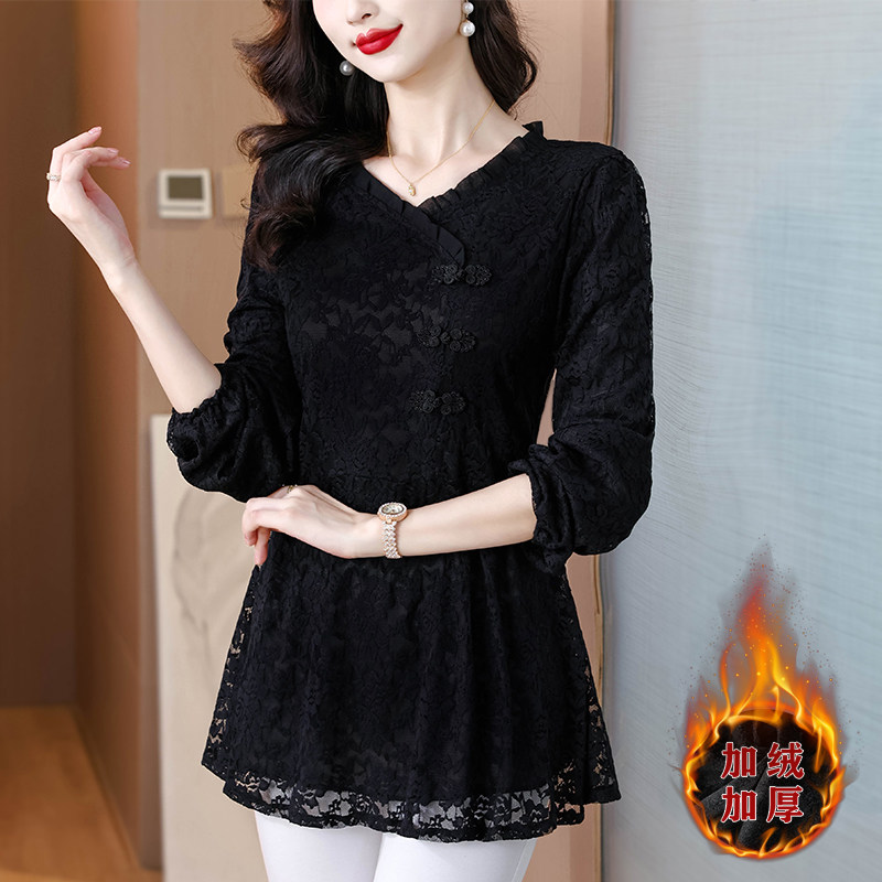 新中式蕾丝裙摆上衣女秋冬加绒保暖中长款t恤大码宽松妈妈打底衫