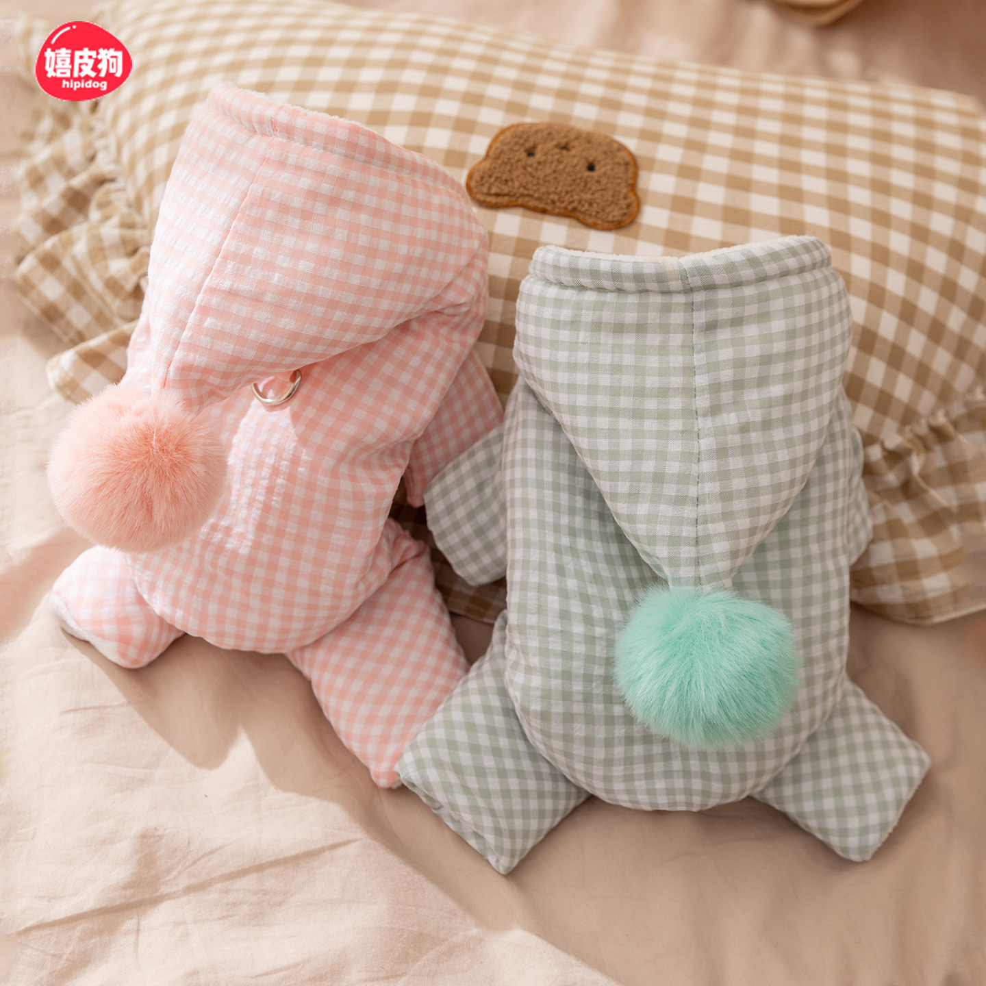 嬉皮狗泡泡格子连帽四脚加厚棉衣