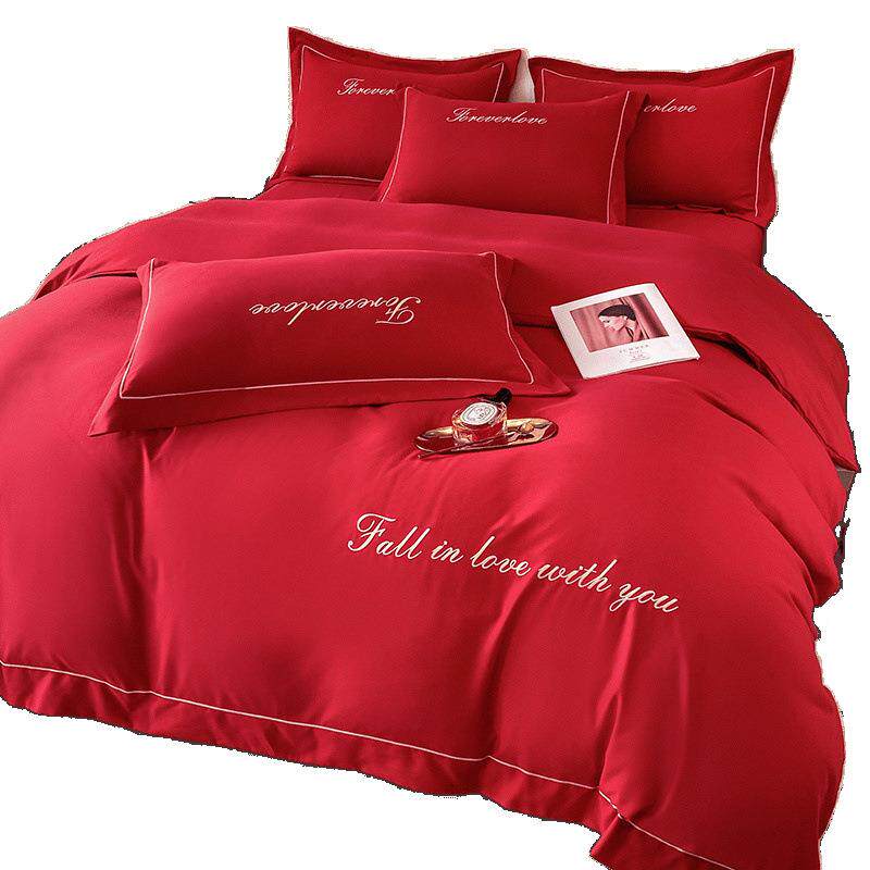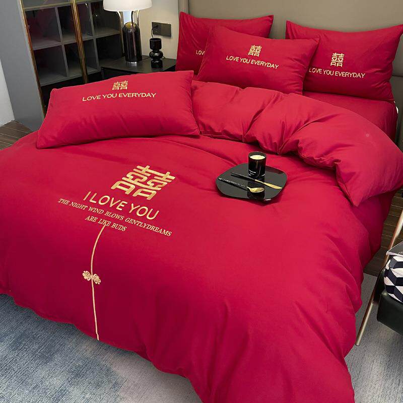大红色婚四厂家直供新件套结婚床上水用品庆洗棉被套床单中式喜庆