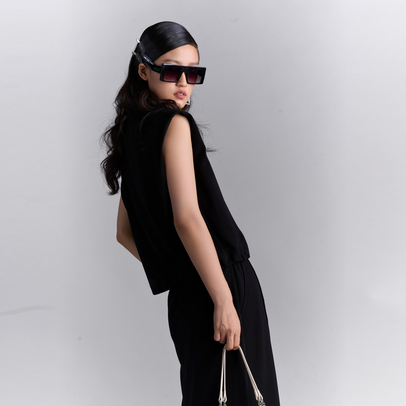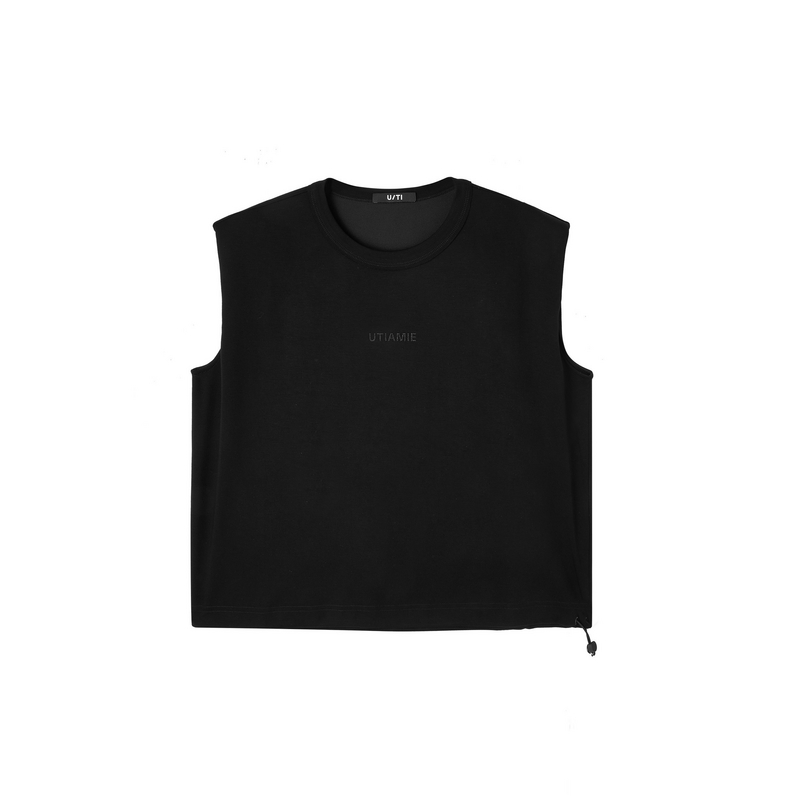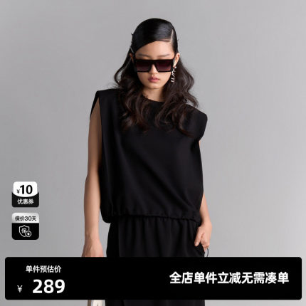 U/TI宽肩无袖T恤背心女装 百搭垫肩抽绳短袖上衣尤缇2025夏季新款