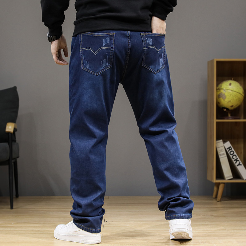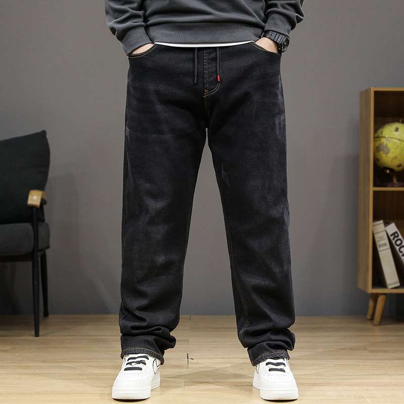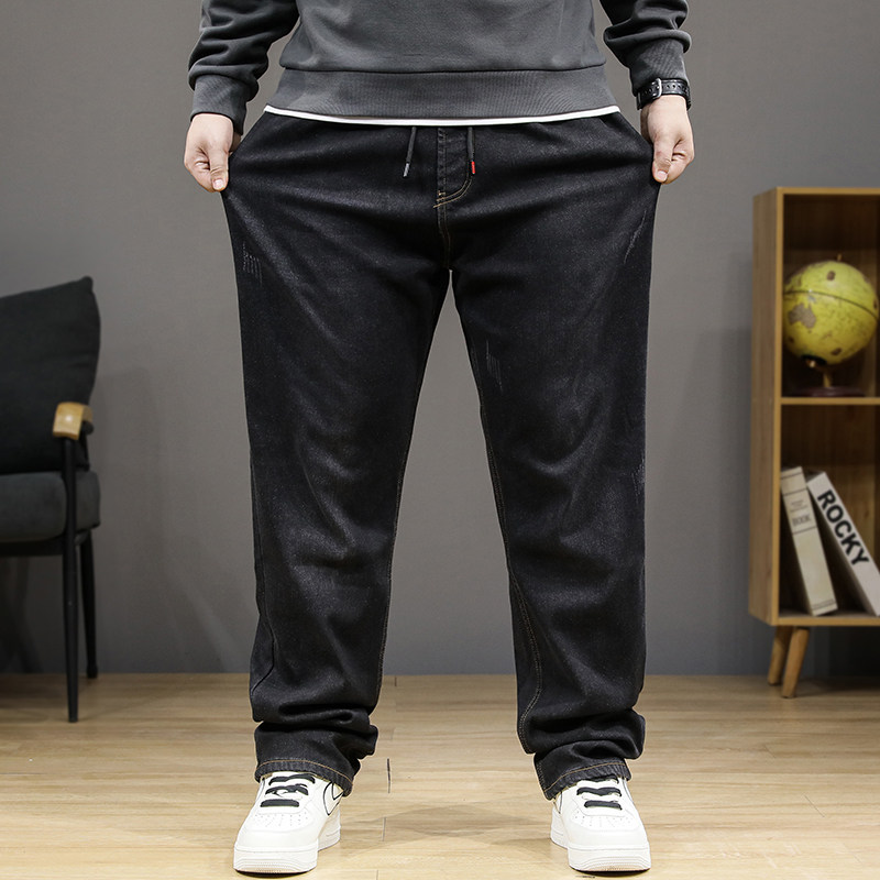 冬季大码加绒牛仔裤男加肥加大宽松直筒高腰松紧腰肥佬保暖裤子潮
