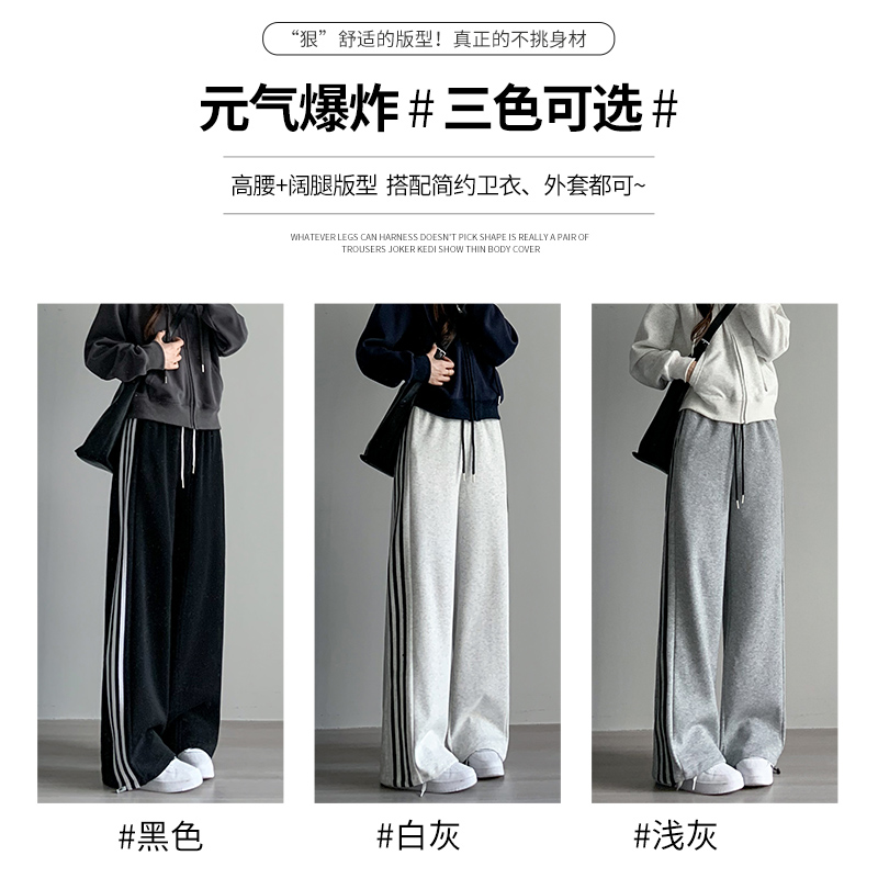 大码黑色条纹运动裤女春秋新款高腰阔腿裤小个子休闲宽松直筒卫裤