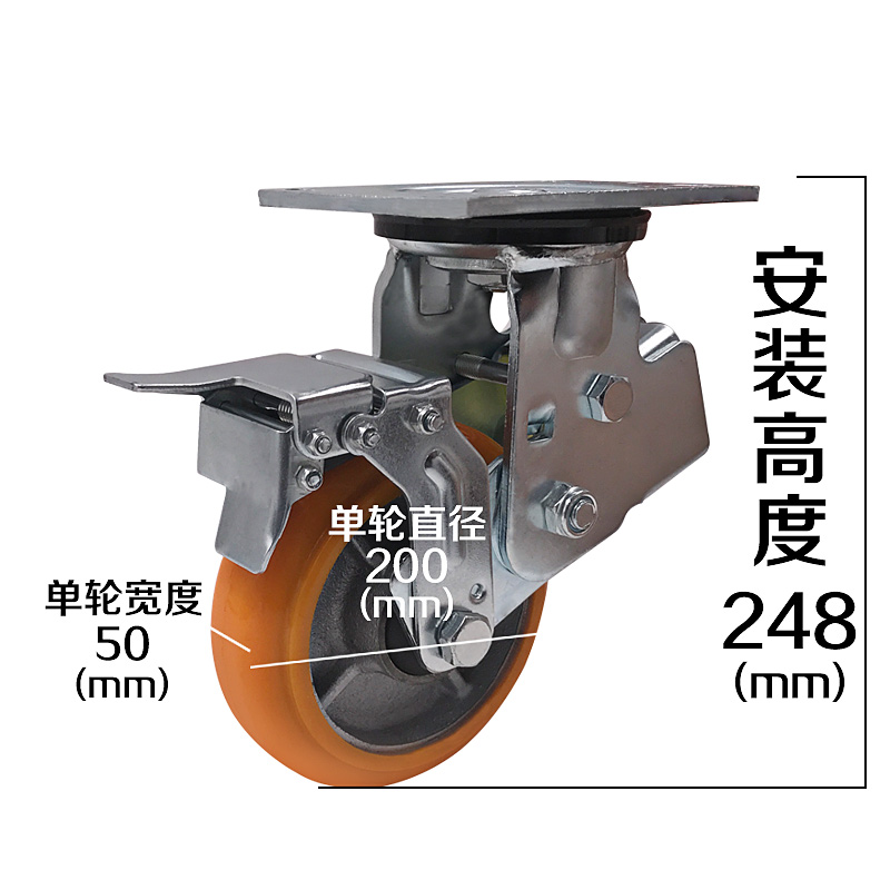8寸重型圆弧铁芯PU带刹车万向轮工业车间脚轮避震减震脚轮万向轮