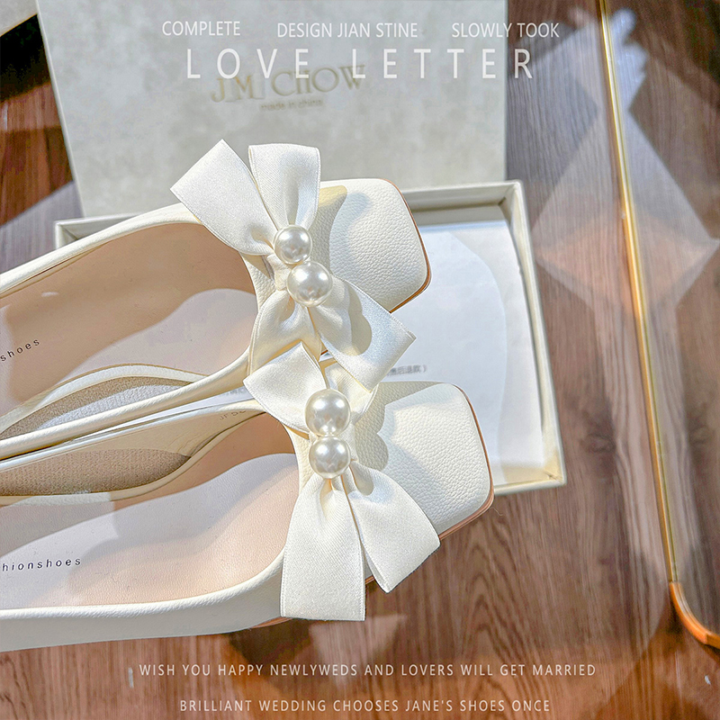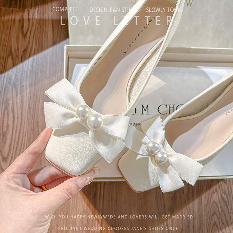 方头蝴蝶结单鞋女订婚鞋新娘粗跟气质不累脚白色绝美小高跟鞋配裙