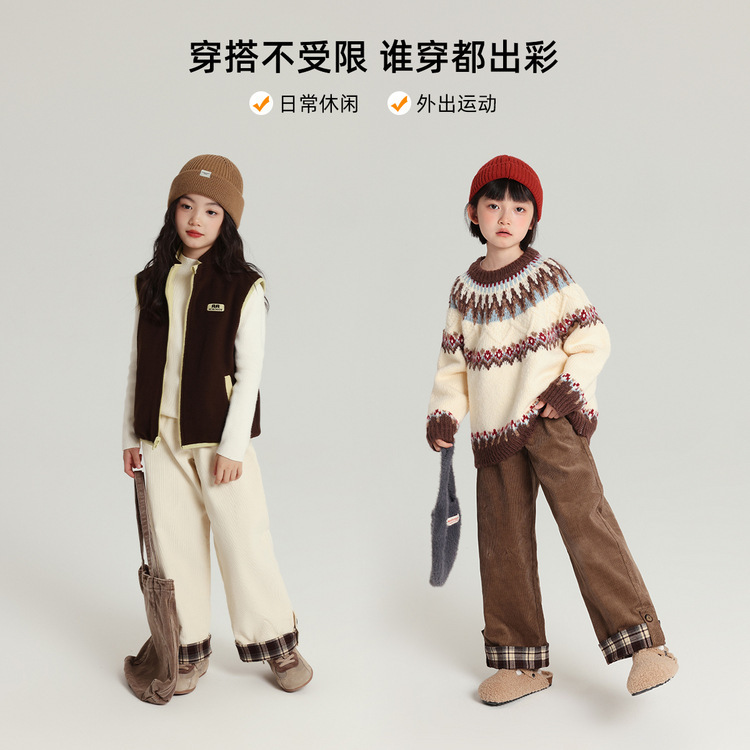 乔伊思童装女童裤子秋冬2025款儿童灯芯绒长复古风裤格纹拼接休闲
