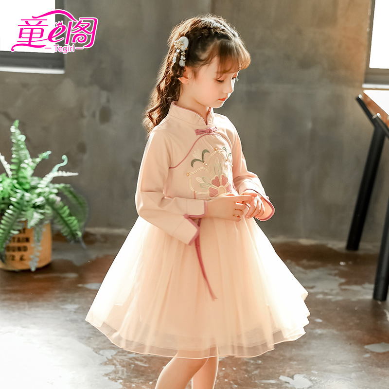 女童中国风旗袍连衣裙秋冬装绣花仙气古风网纱裙子儿童复古汉服裙