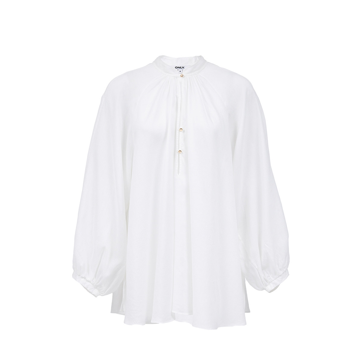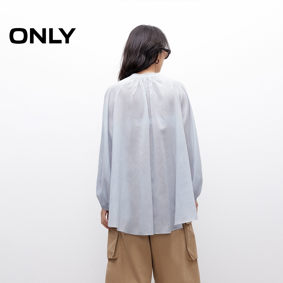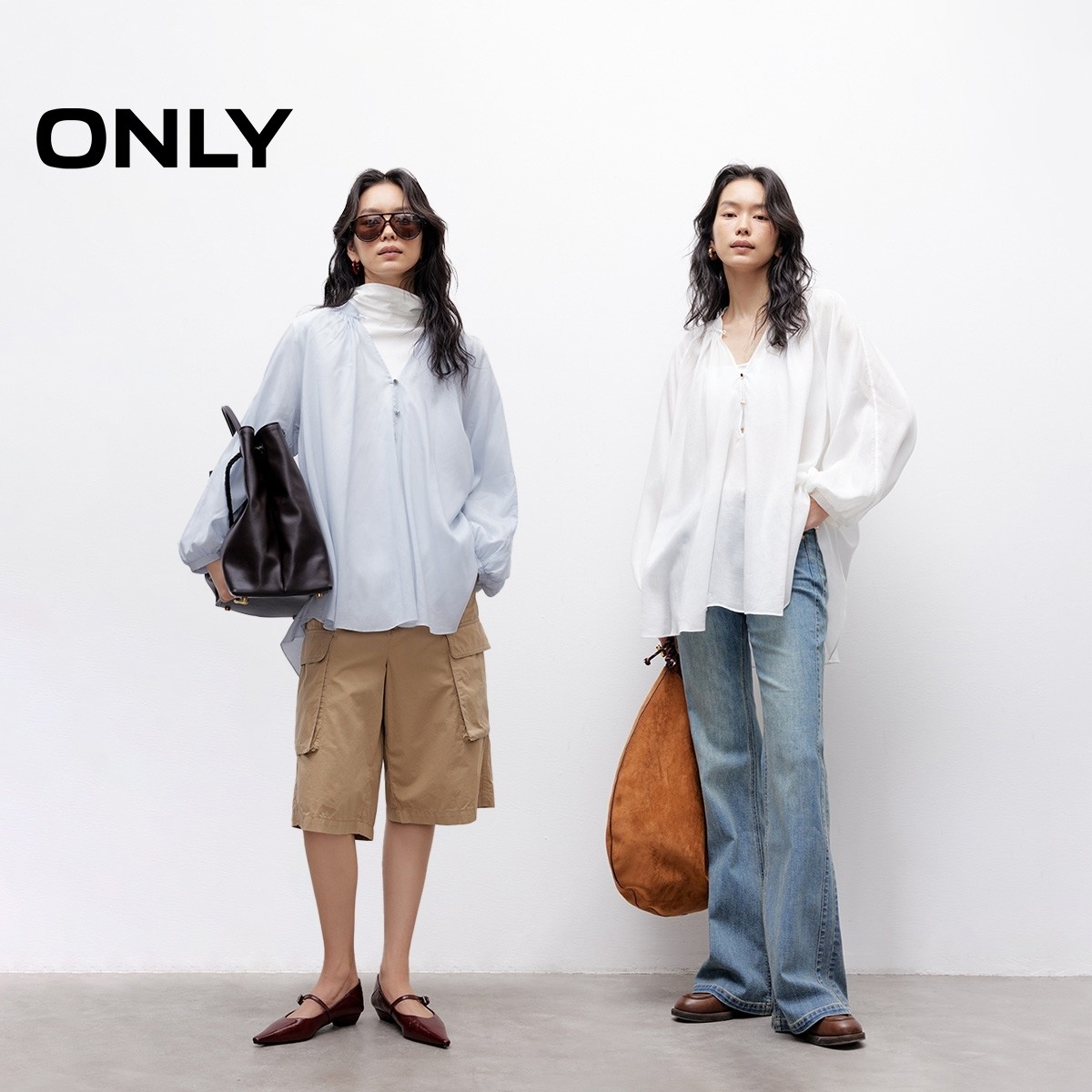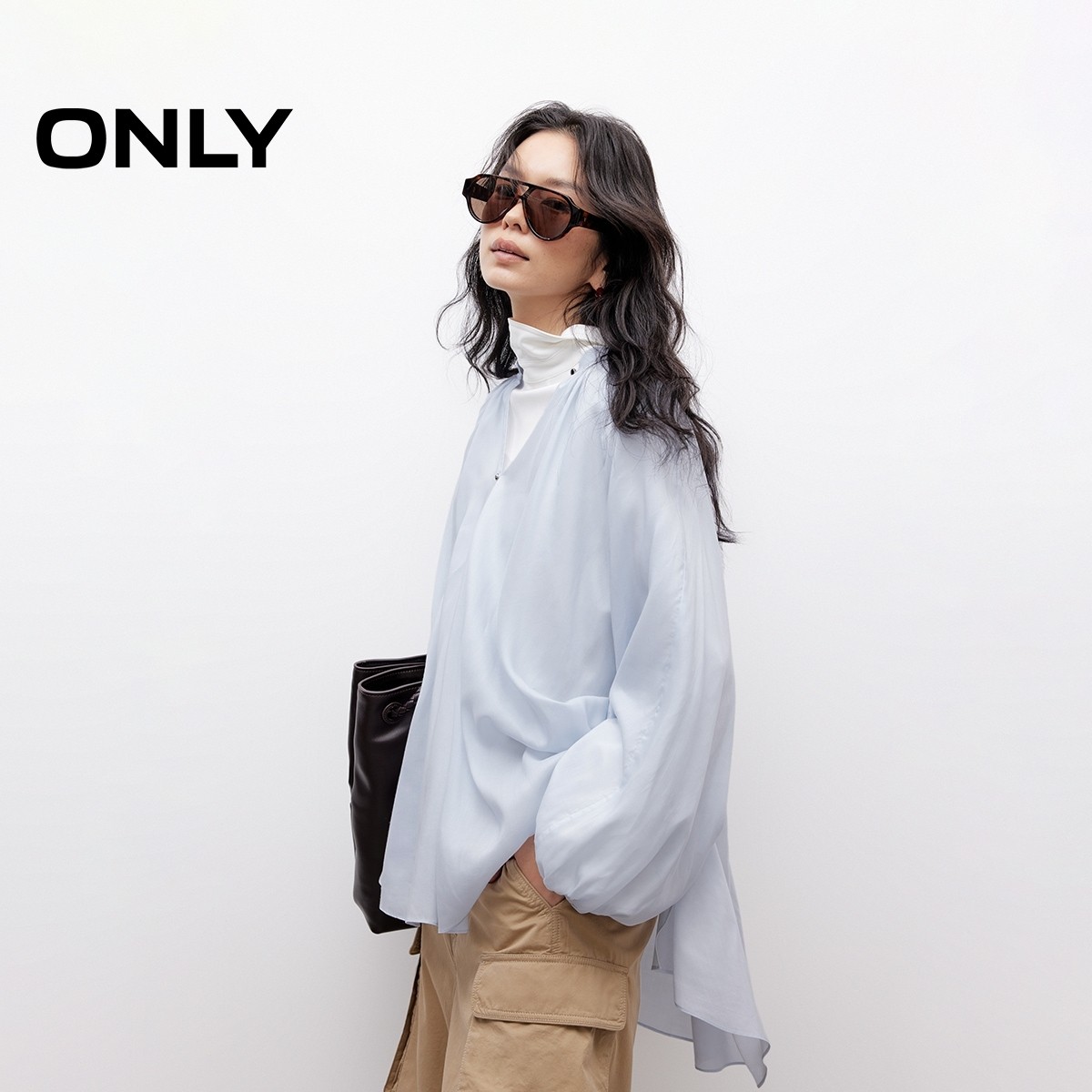 绫致ONLY25春法式慵懒风定制纽扣纯色宽松V领泡泡袖雪纺衫女