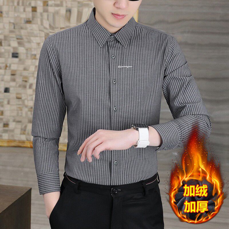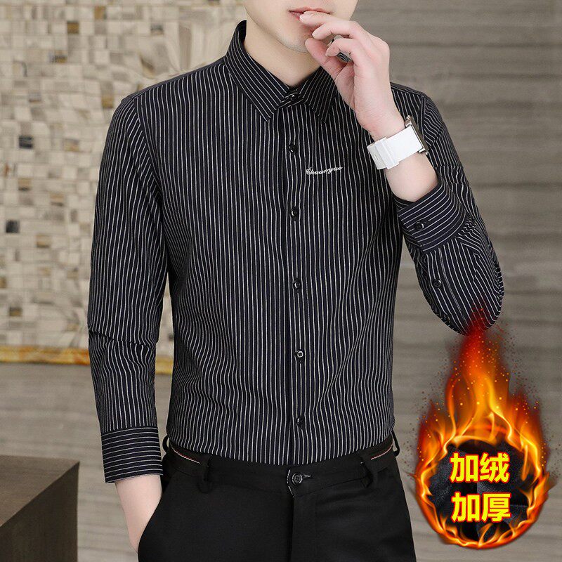 秋冬季长袖条纹衬衫男休闲商务加绒加厚男装上衣潮流修身保暖衬衣