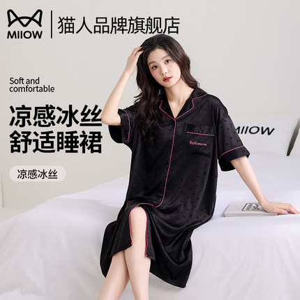猫人冰丝女款睡裙短袖中长款连衣裙简约凉感高级感睡衣家居服薄款