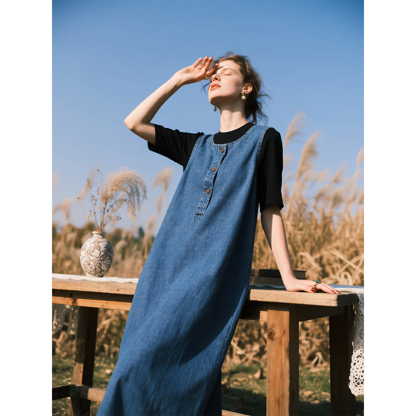复古蓝色牛仔背心连衣裙女2026年春季新款无袖松弛感显瘦气质长裙