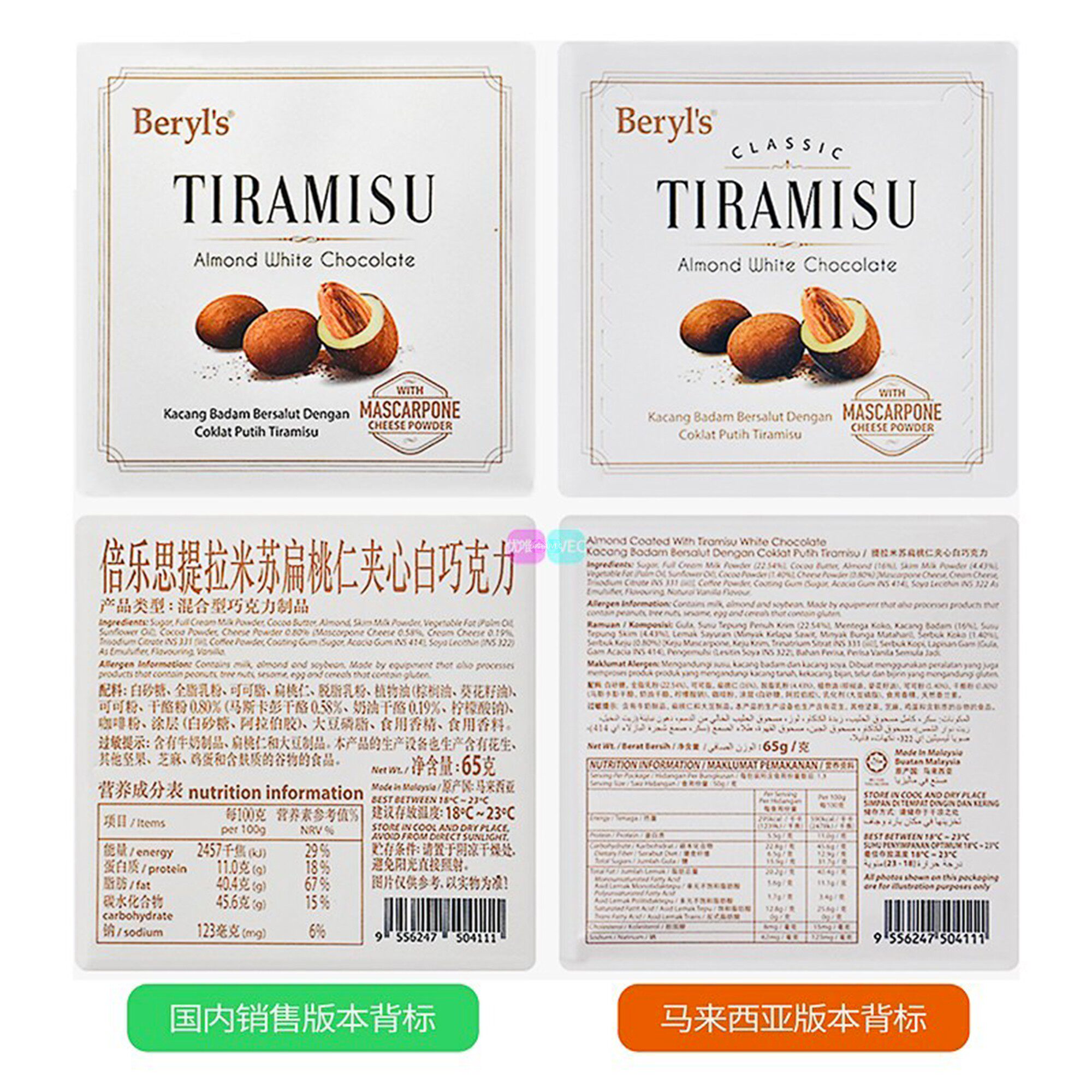 马来西亚进口零食beryls倍乐思提拉米苏扁桃仁夹心巧克力盒装65g
