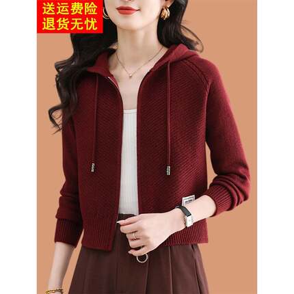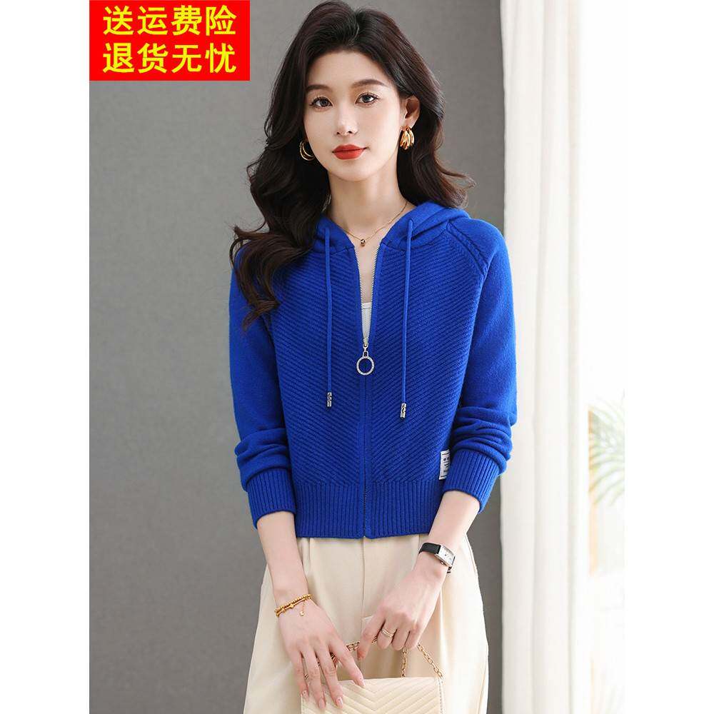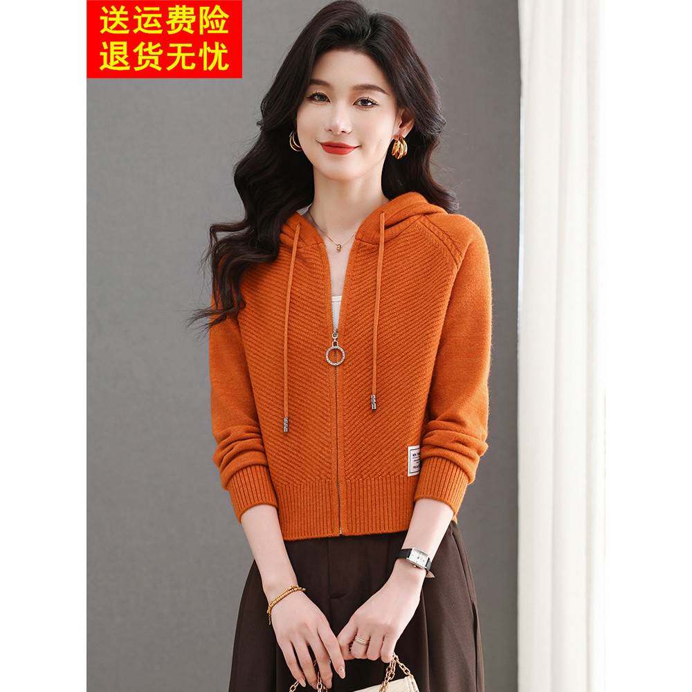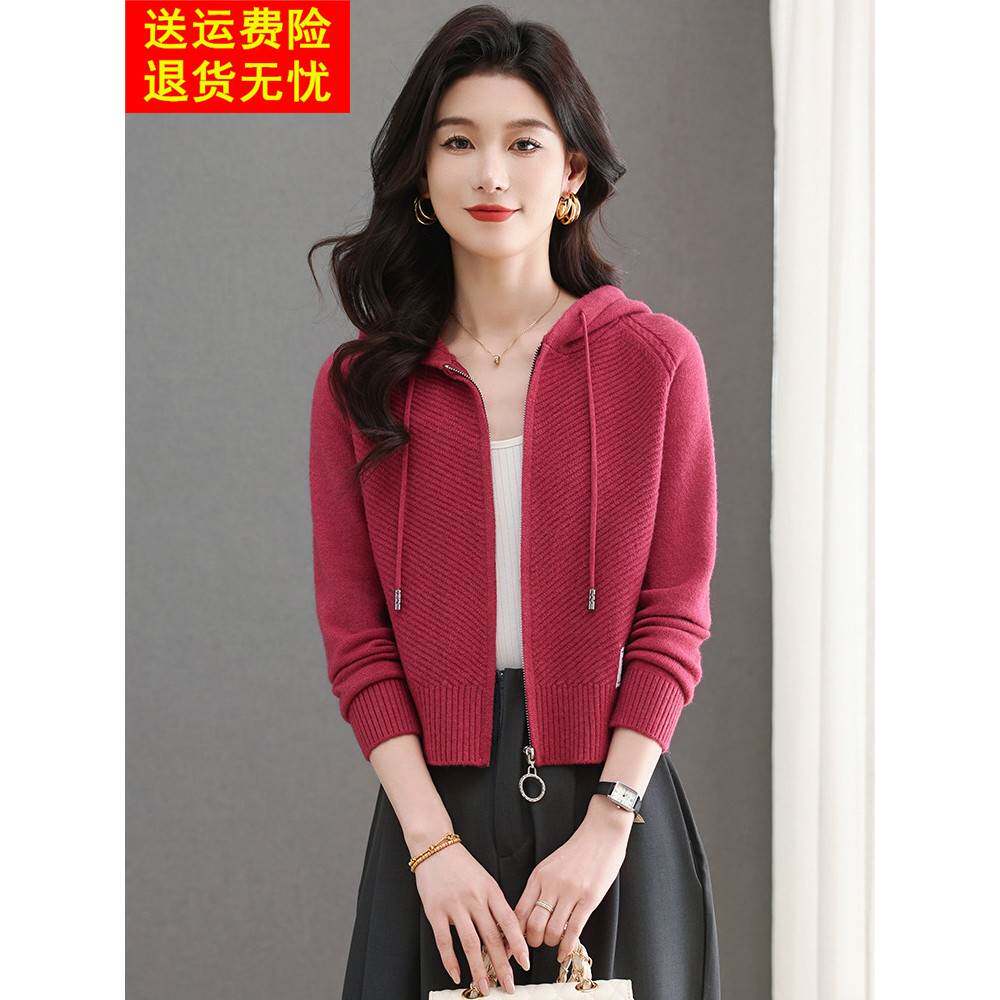 鄂尔多斯市连帽拉炼羊毛针织开衫女春短款小个子时尚百搭毛衣外套