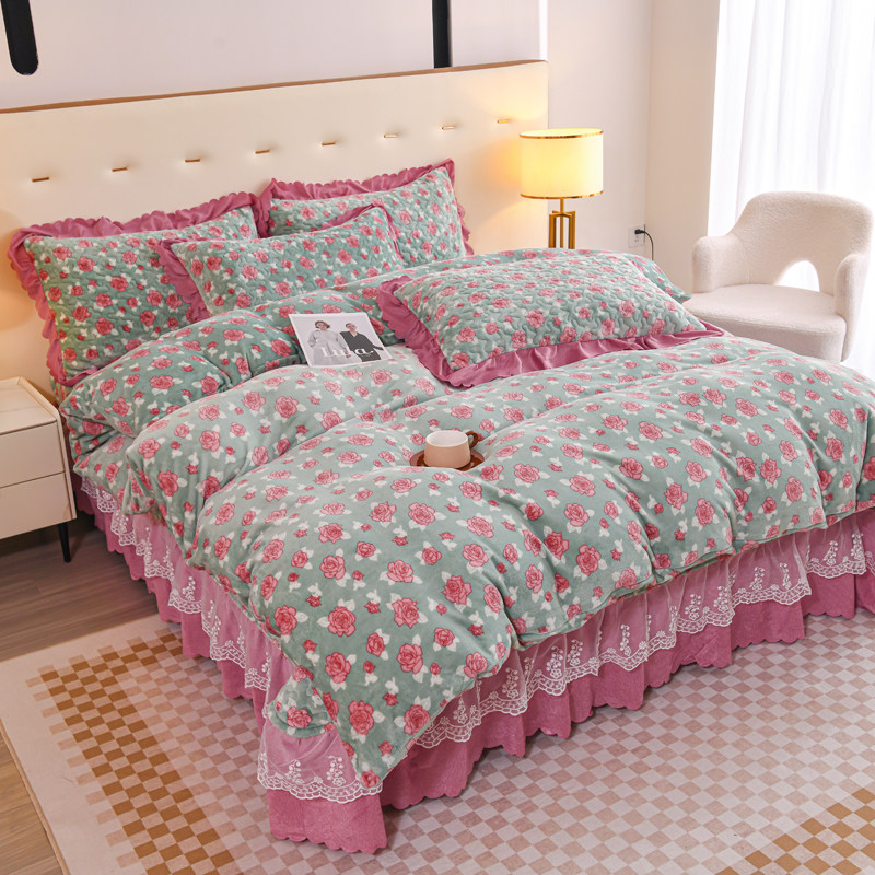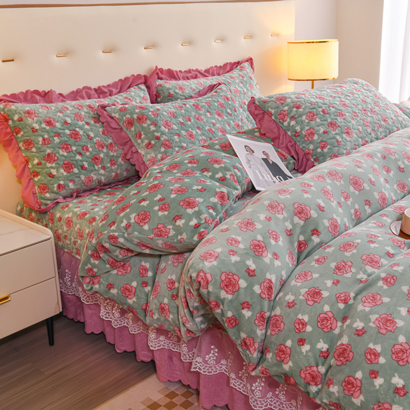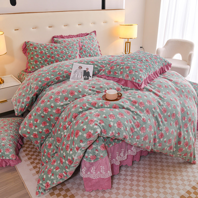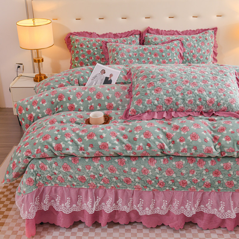 新款夹棉加厚牛奶绒床盖四件套秋冬保暖珊瑚绒床裙单件三件套防滑