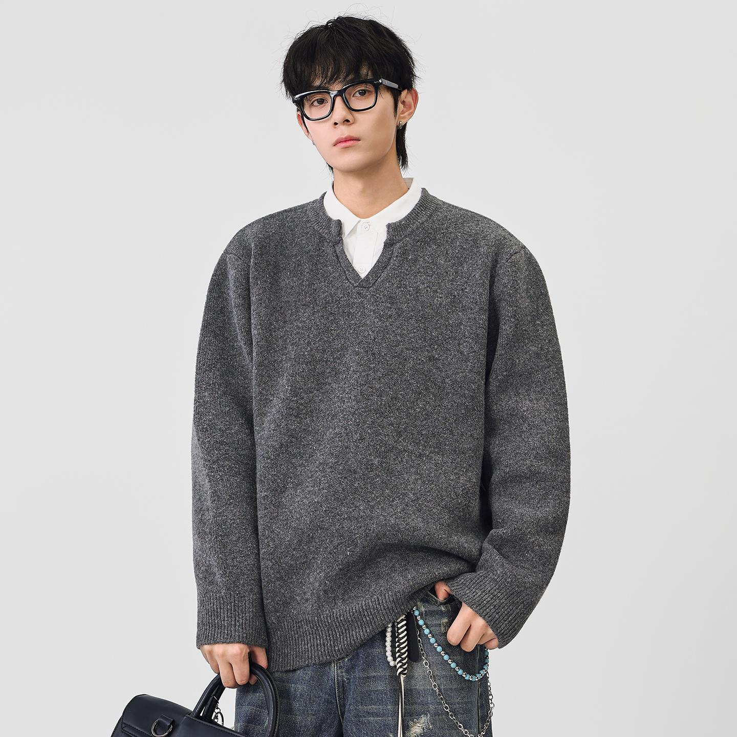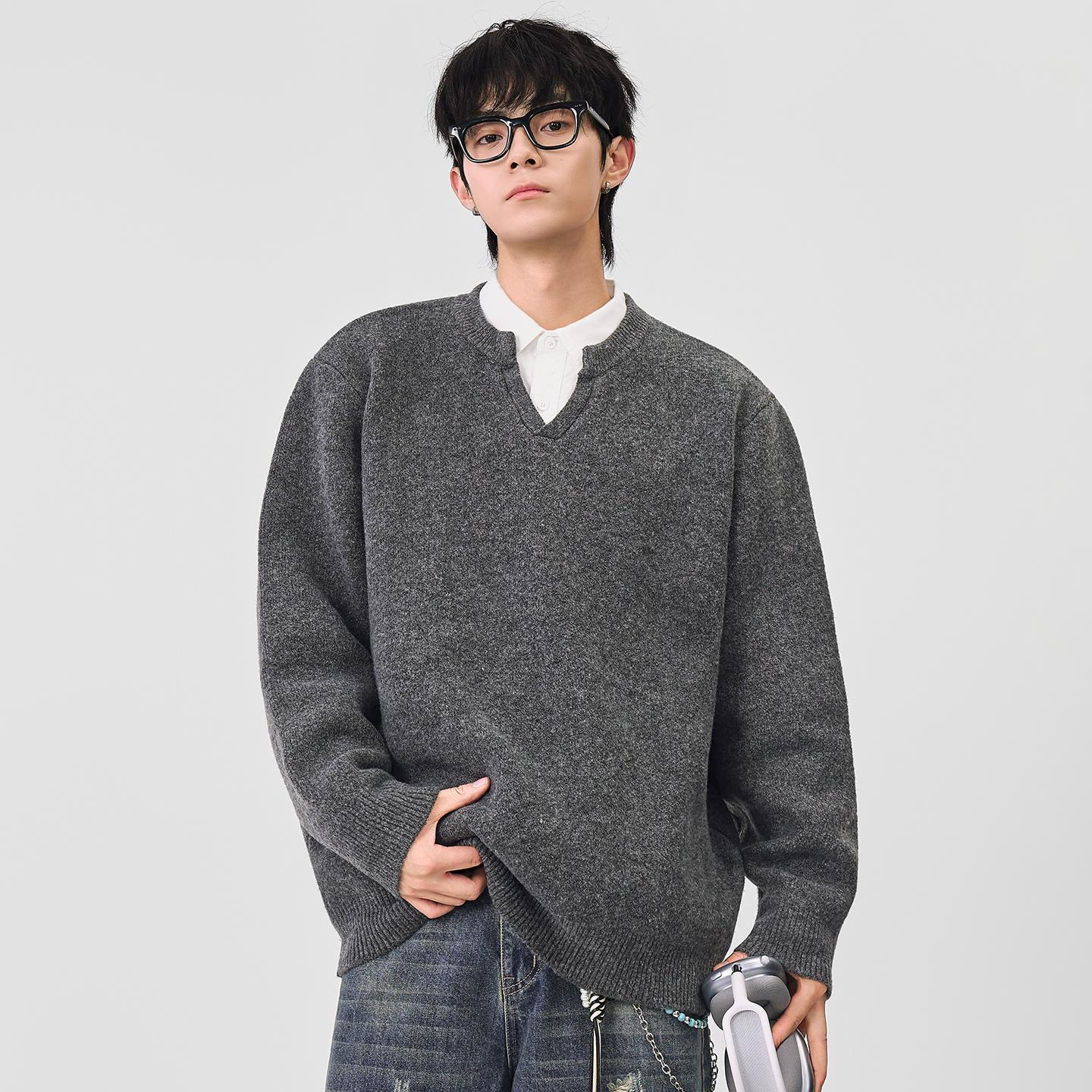 以纯秋冬季针织衫男士日系纯色毛衣套头v领宽松外套情侣款潮