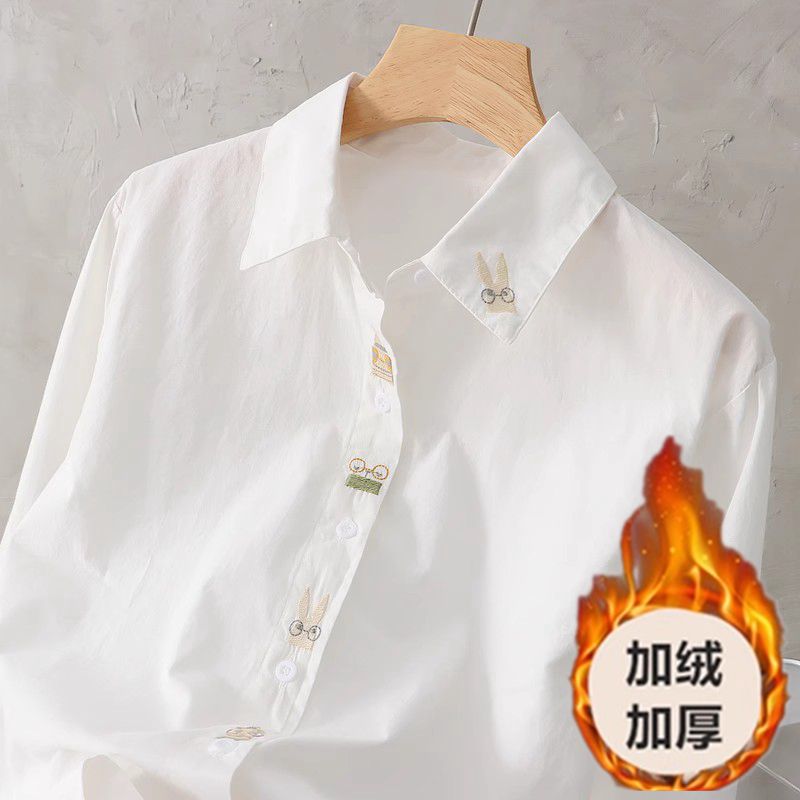 文艺小清新卡通兔子刺绣宽松纯棉加绒白衬衫女长袖打底衫学生大码