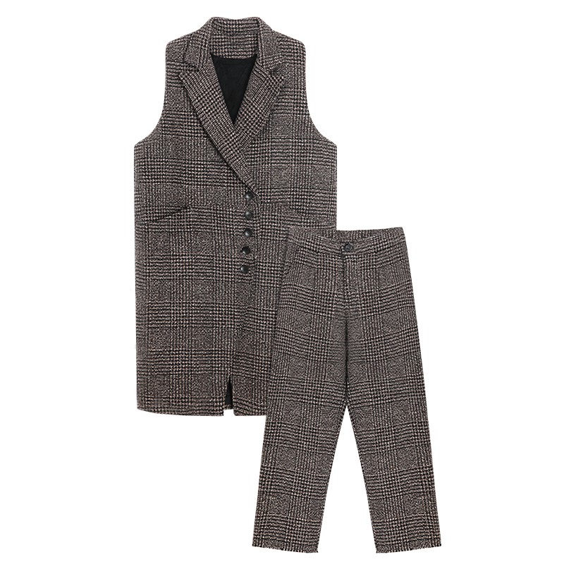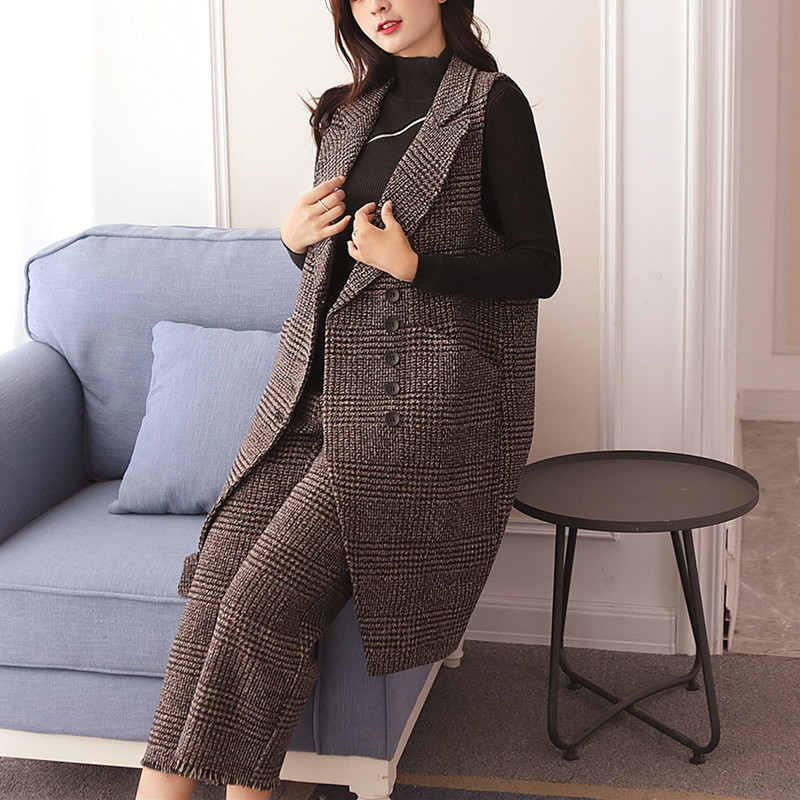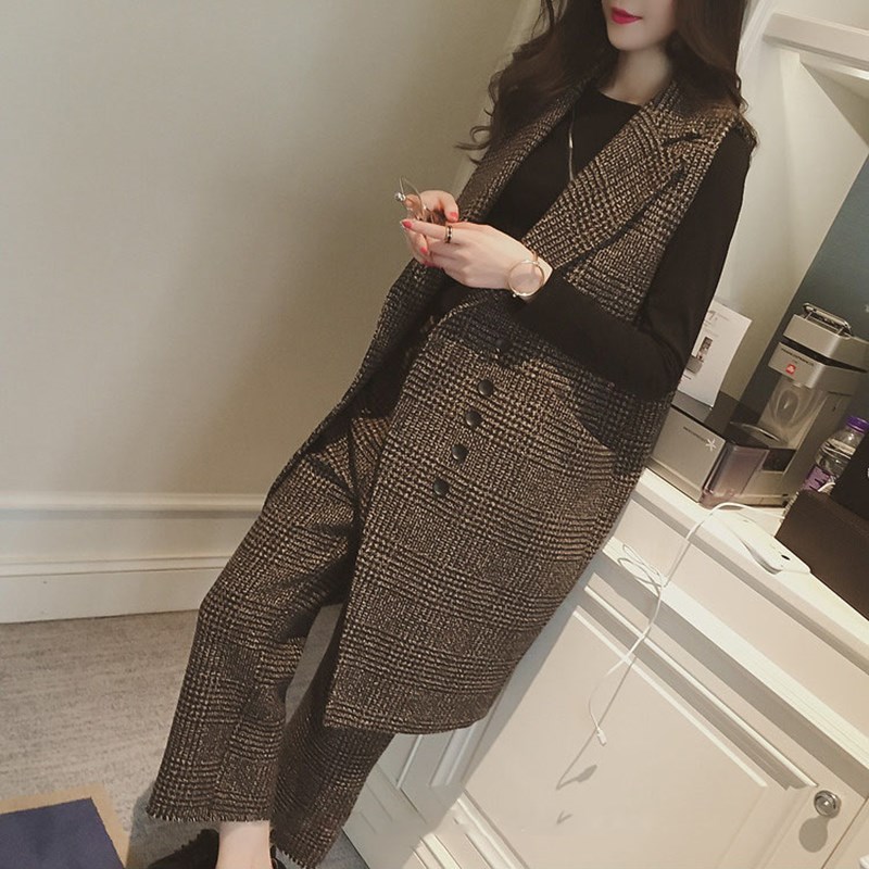 洋气时尚女秋冬气质显瘦复古厚毛呢西装马甲阔腿裤两件套马夹套装