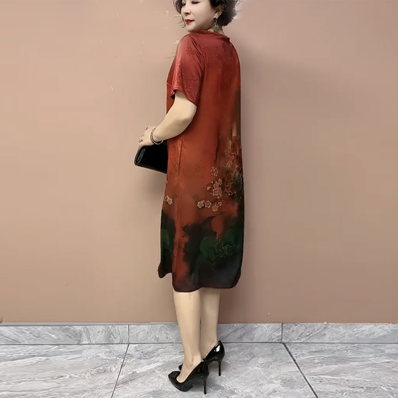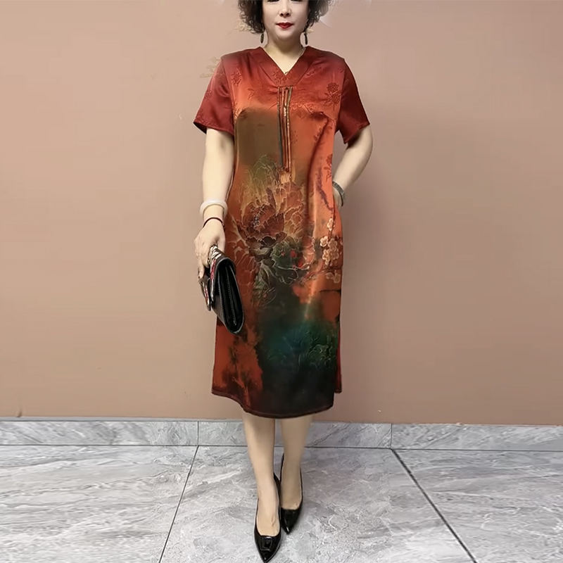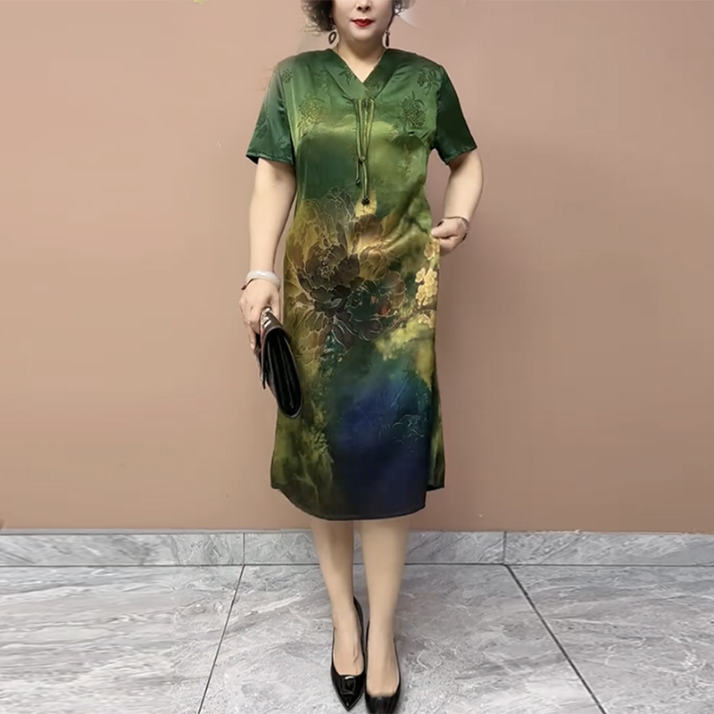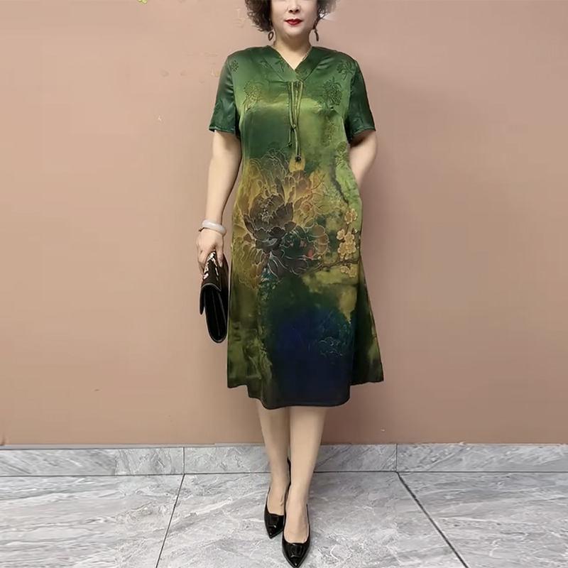高档真丝连衣裙气质妈妈桑蚕丝印花新中式旗袍裙定位花显瘦长裙女