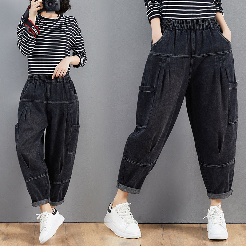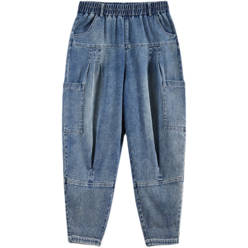 韩版大码女装牛仔垮裤子秋冬新品宽松磨白吊裆高腰显瘦休闲哈伦裤