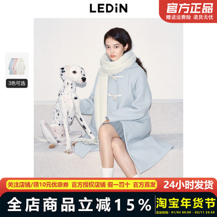 乐町韩系少女风长款连帽牛角扣大衣秋冬季新款圈圈毛呢外套女