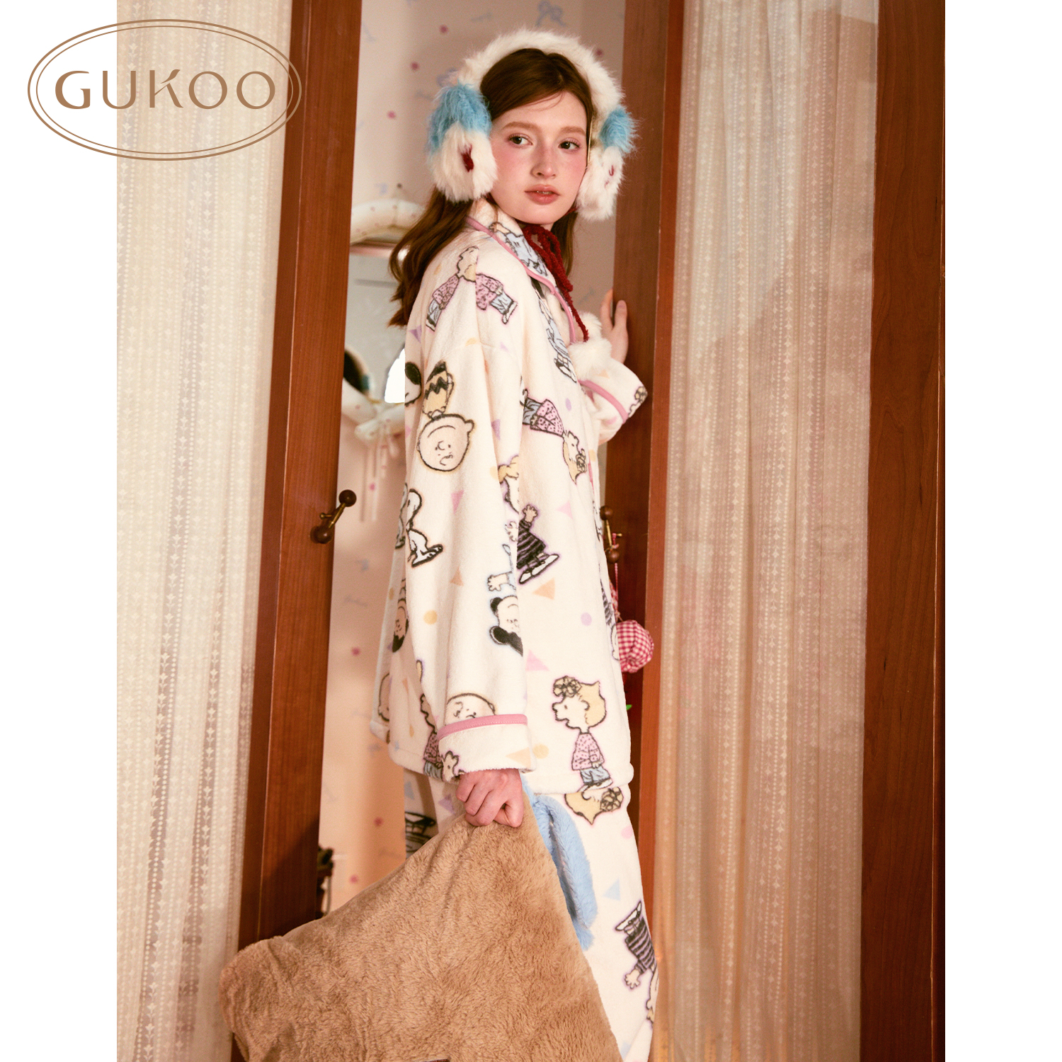 Gukoo/果壳冬季睡衣翻领史努比卡通舒适加厚保暖女士家居服套装