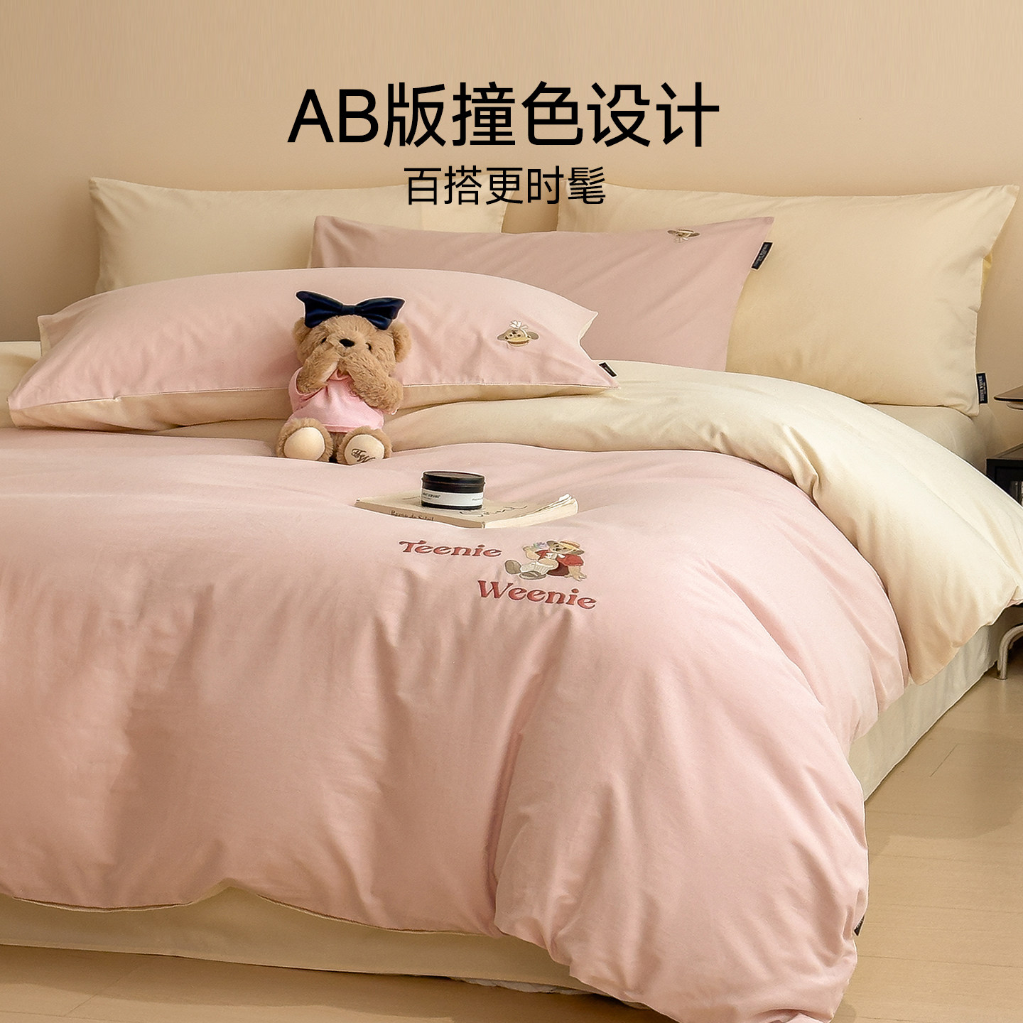 TeenieWeenie简约粉色磨毛被套床上四件套纯棉全棉秋冬床单床笠