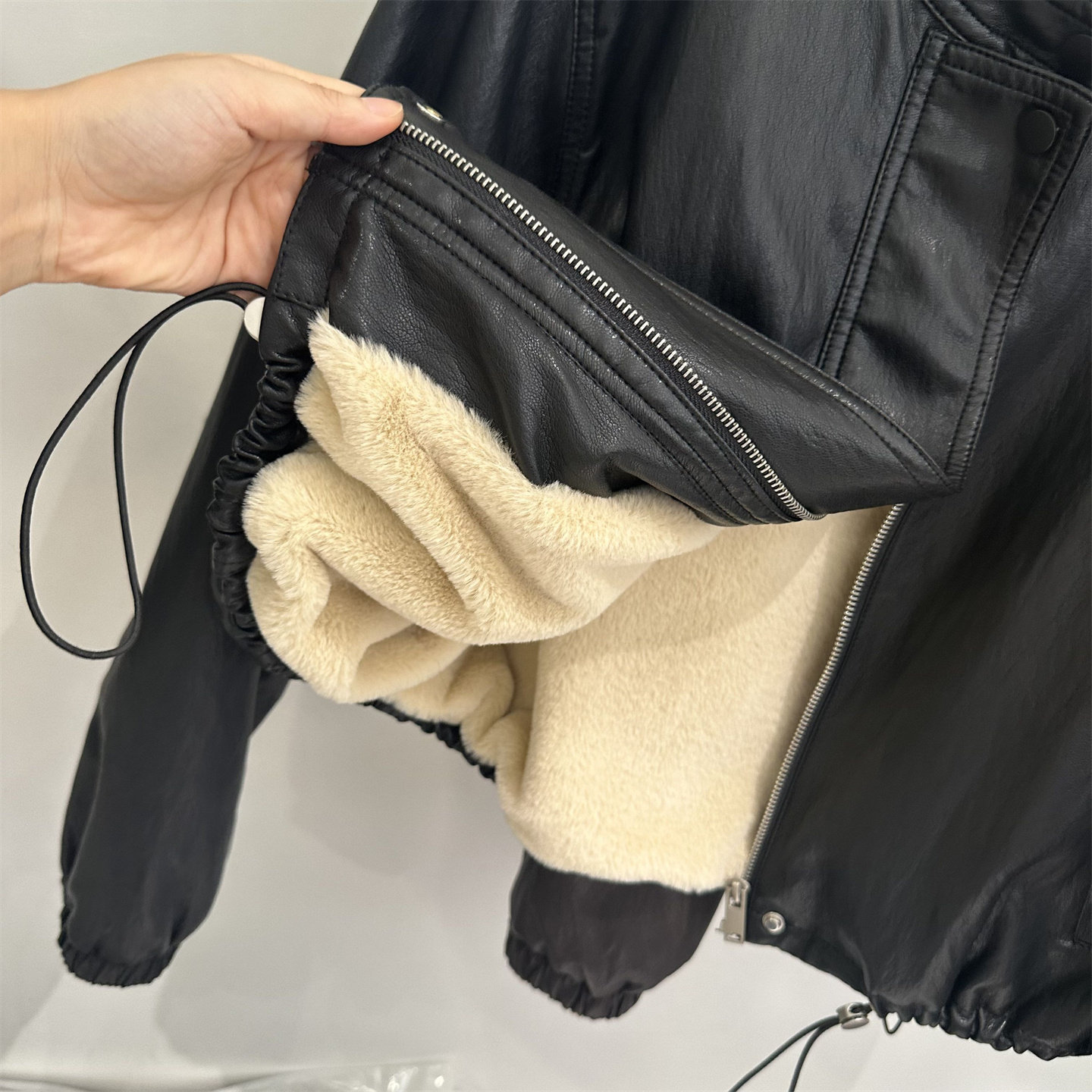 韩版黑色PU加绒皮衣女短款宽松