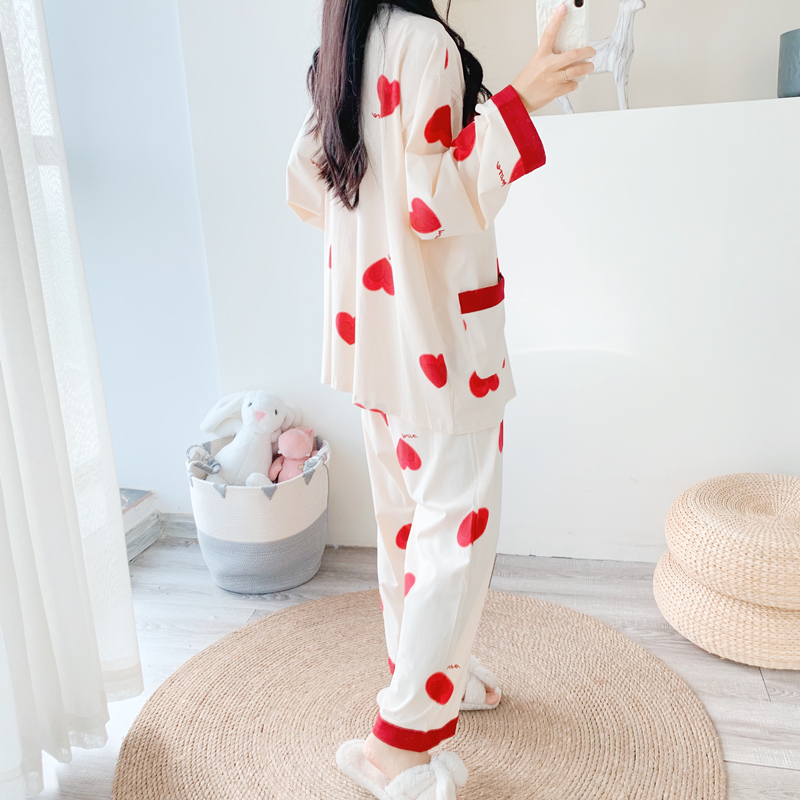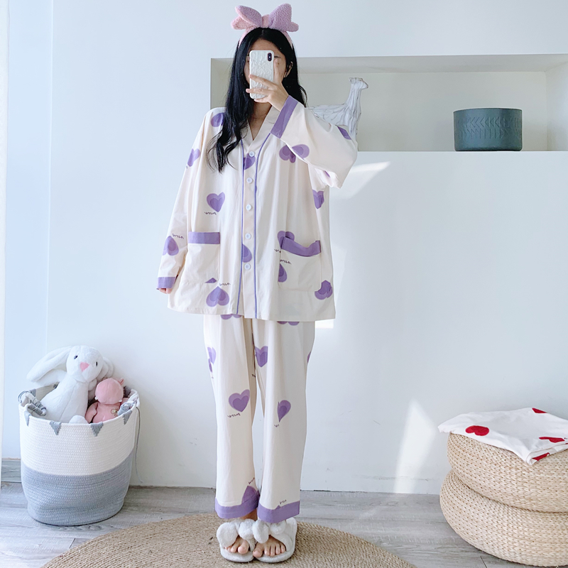 V领爱心纯棉开扣加肥大码睡衣宽松套装长袖长裤胖MM200斤家居服女