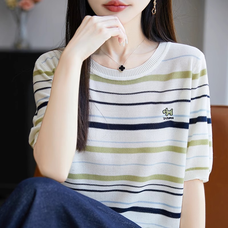 刺绣条纹莱赛尔天丝针织短袖T恤女2025夏轻薄舒适半袖t恤上衣小衫