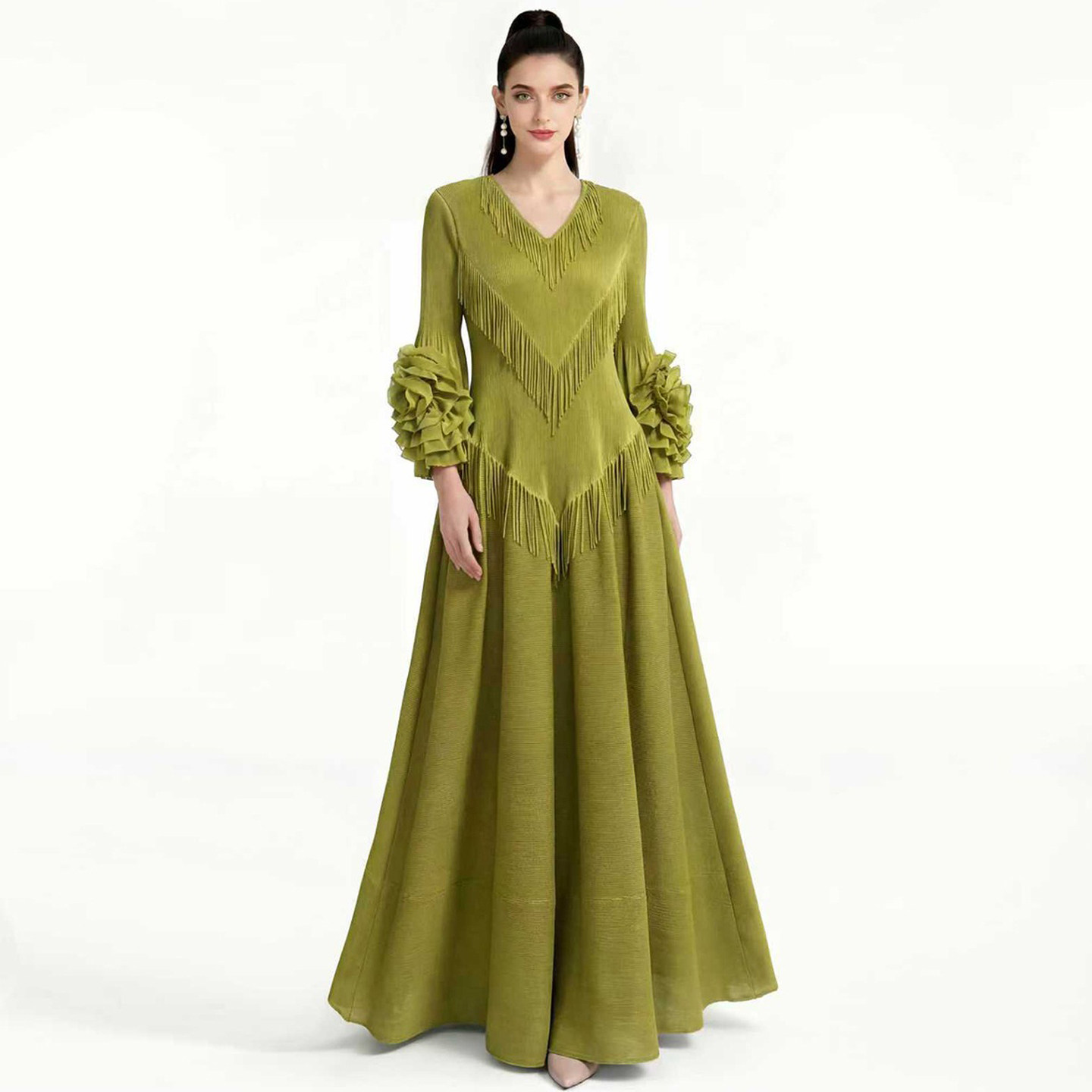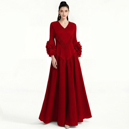 名媛明星款糖果色流苏V领走秀礼服法式英伦风高级感精致连衣裙女