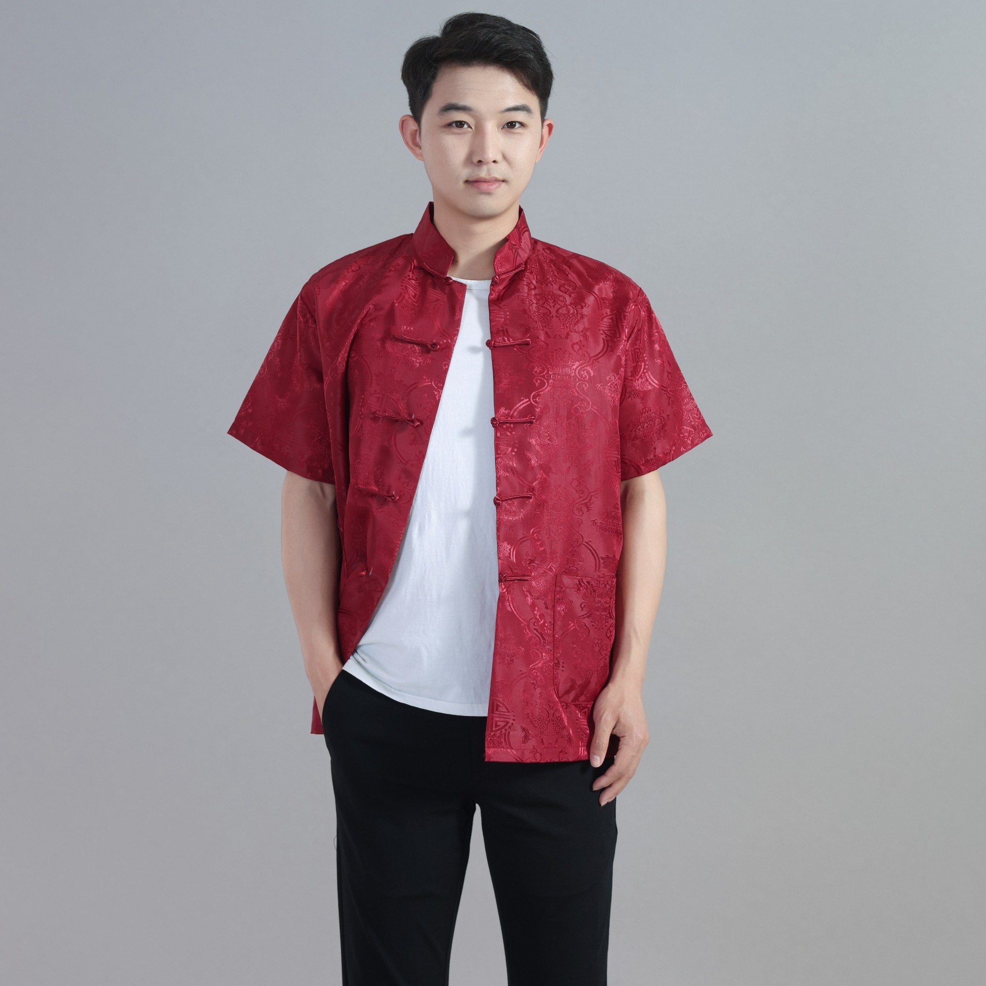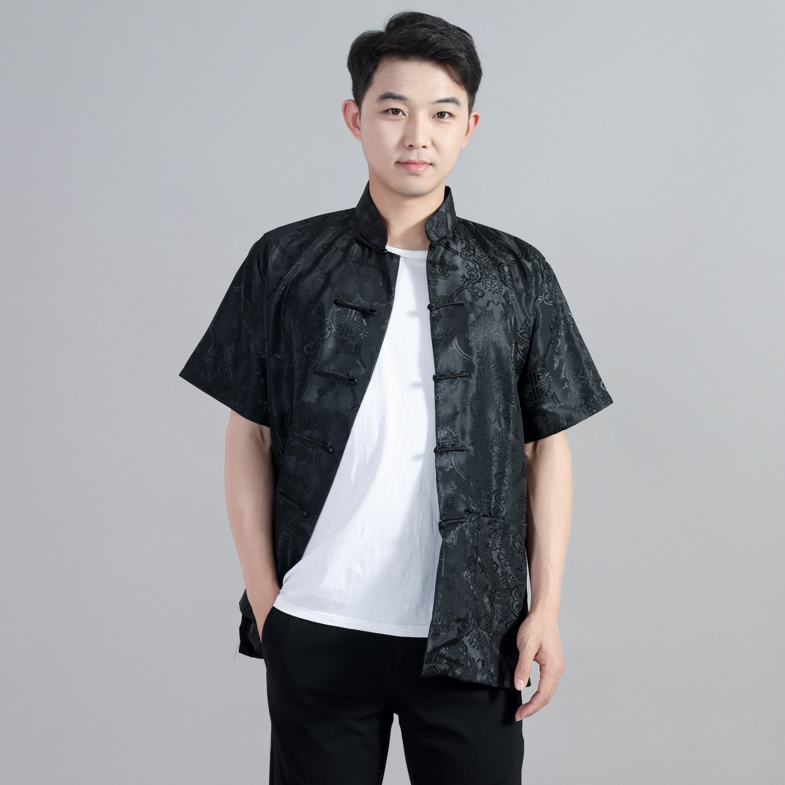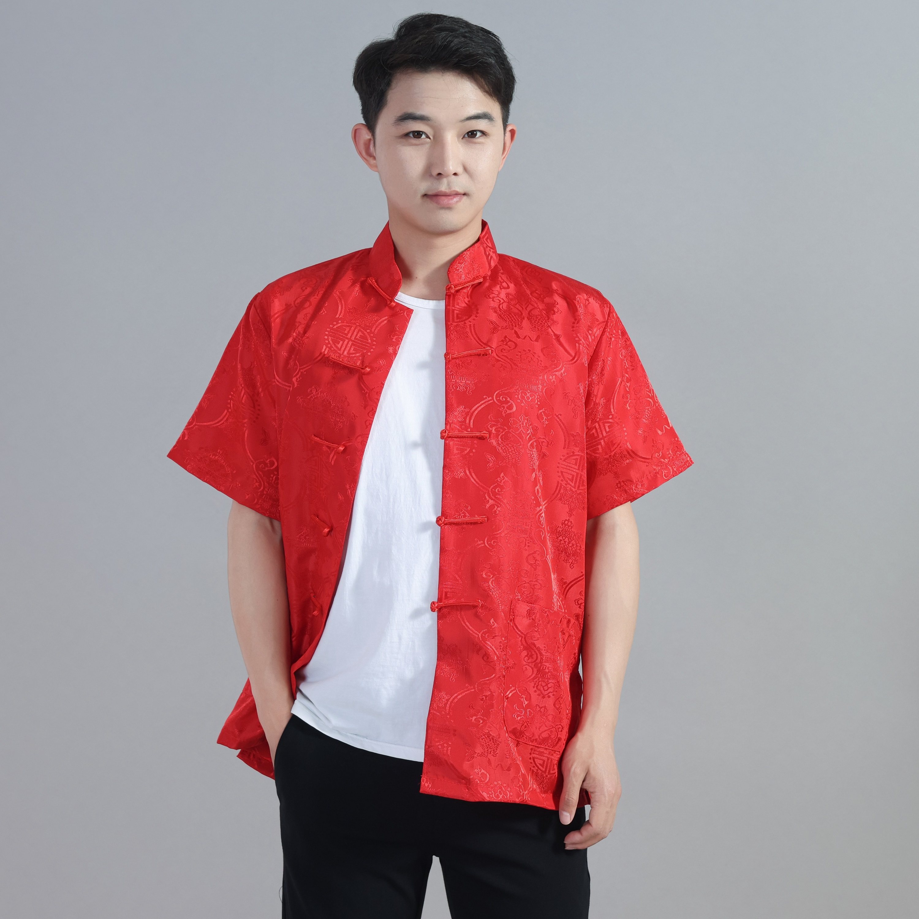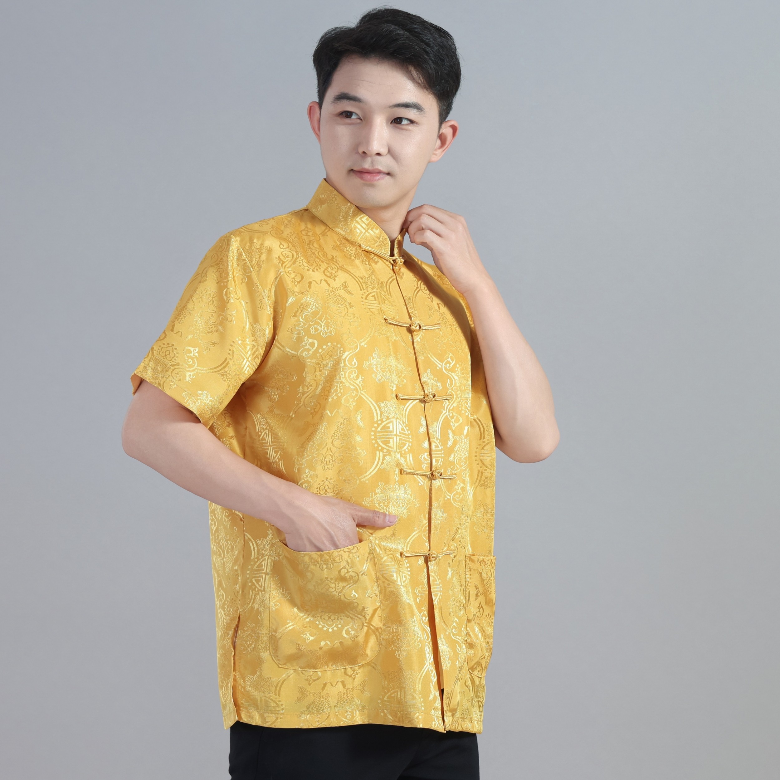 休闲舞台表演出男士民族青年中国风夏季中式绸缎短袖上衣唐装汉服