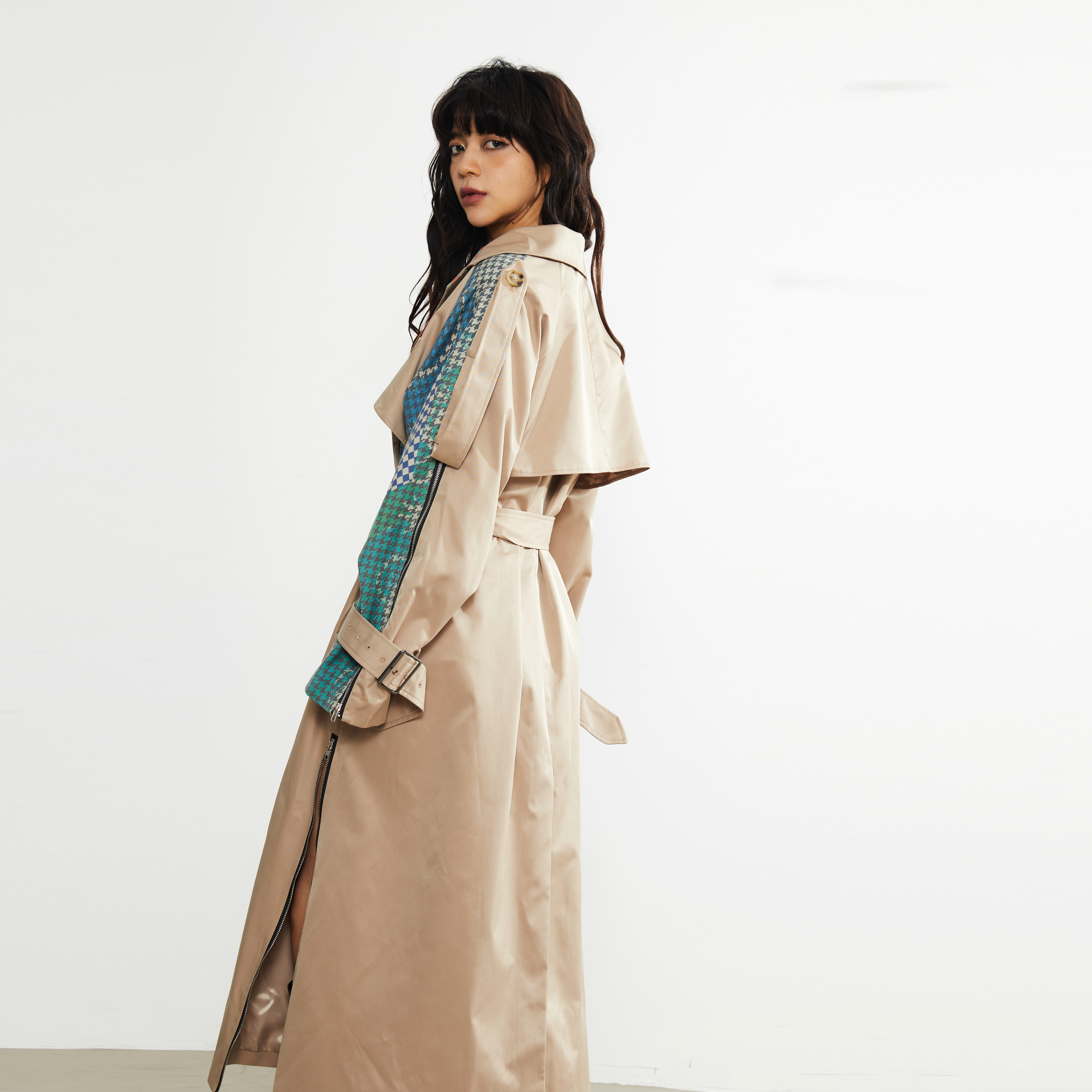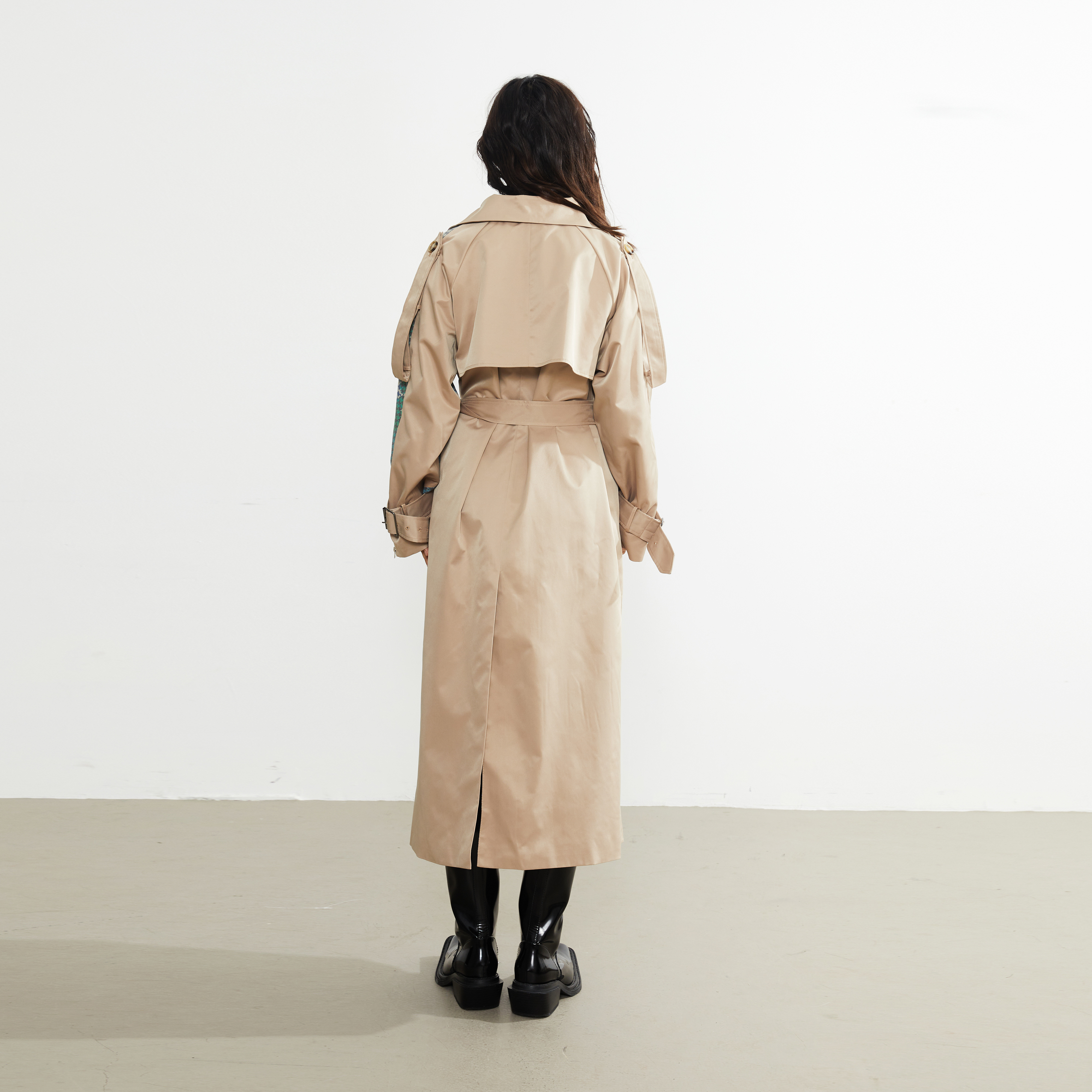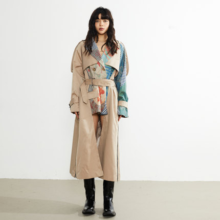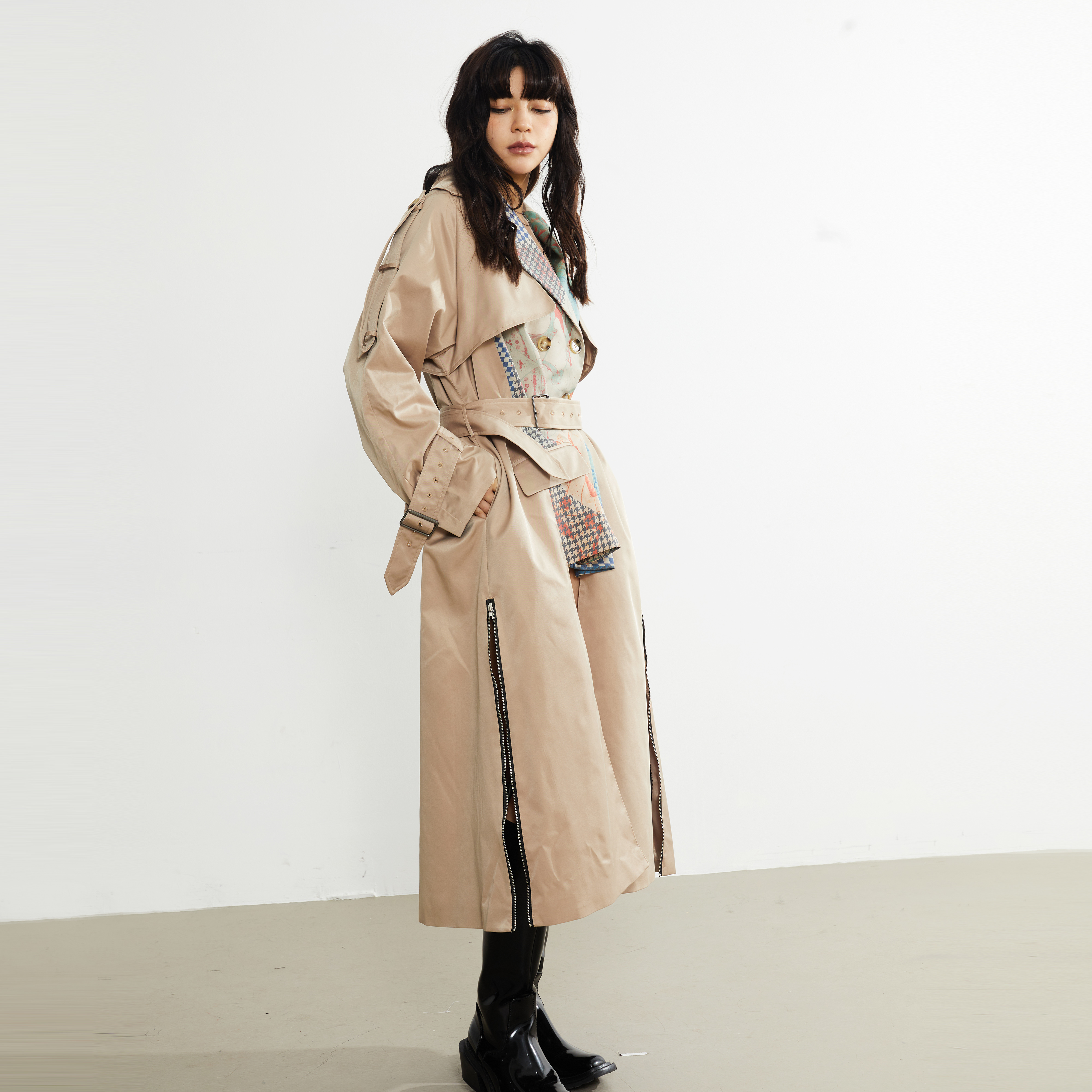 JNYLON印象印花西装拼接假两件风衣女中长款