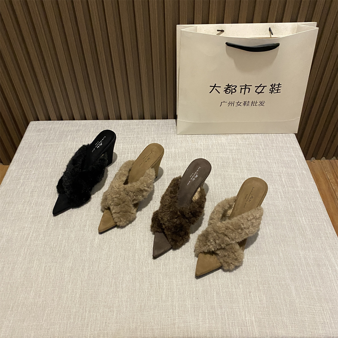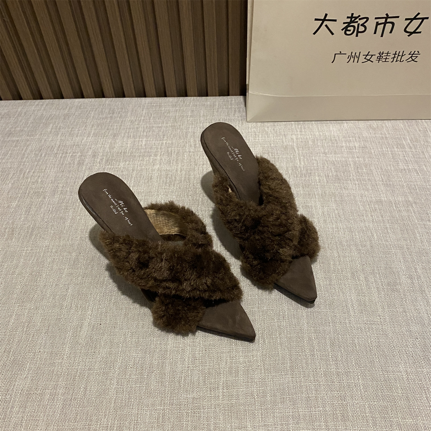 毛毛尖头高跟拖鞋女外穿坡跟凉拖