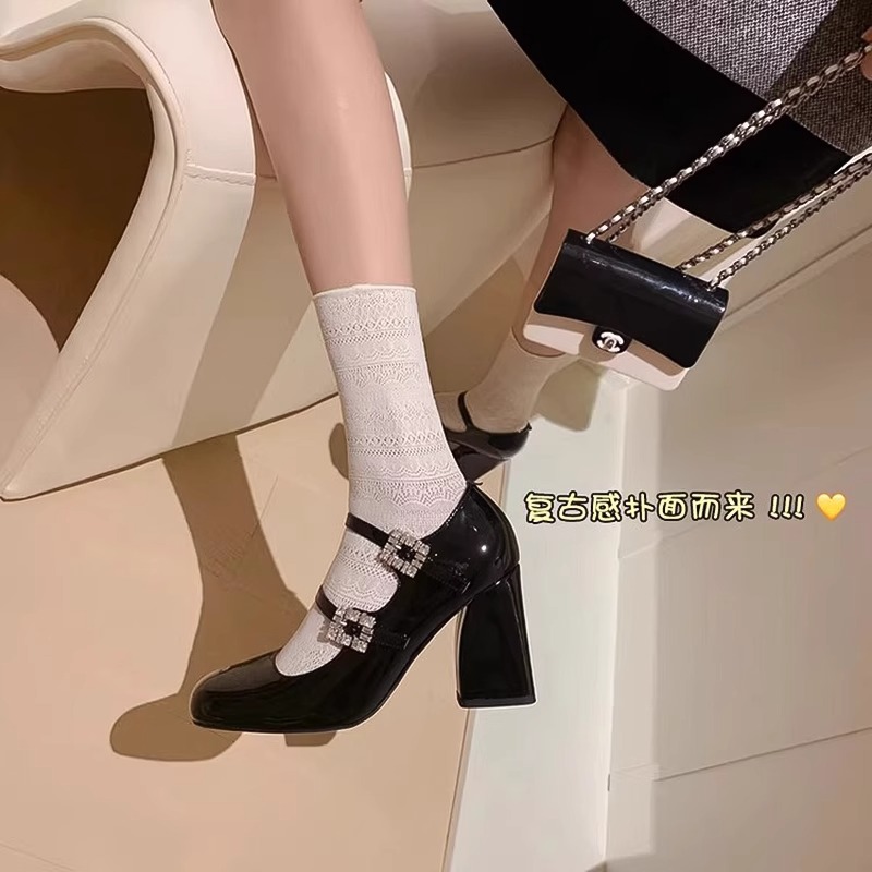 一字带时尚黑色高跟玛丽珍鞋