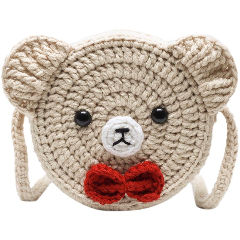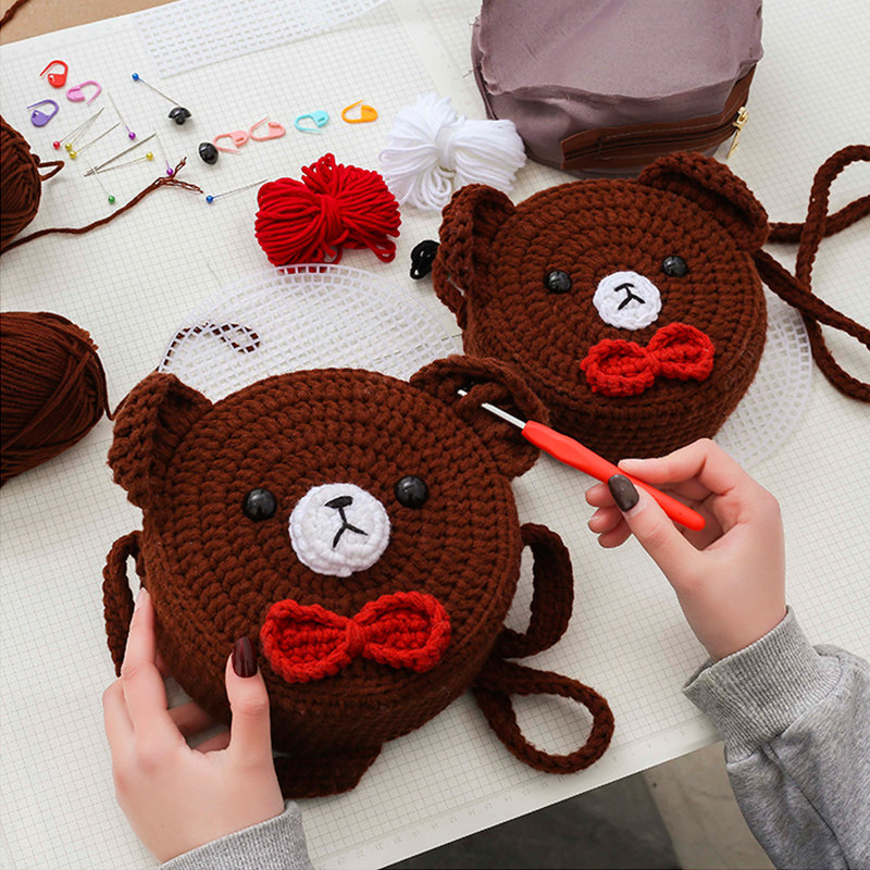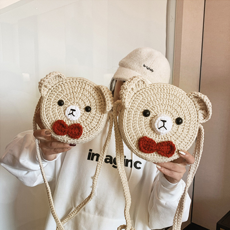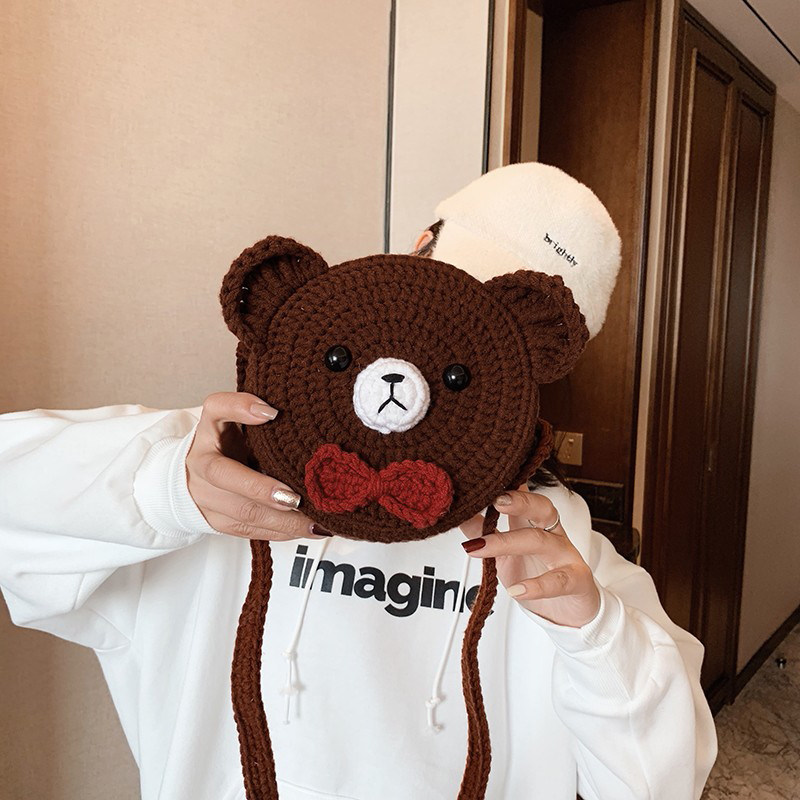 手工编织包包diy材料包网红小熊圆包网格毛线自制单肩斜挎包成品