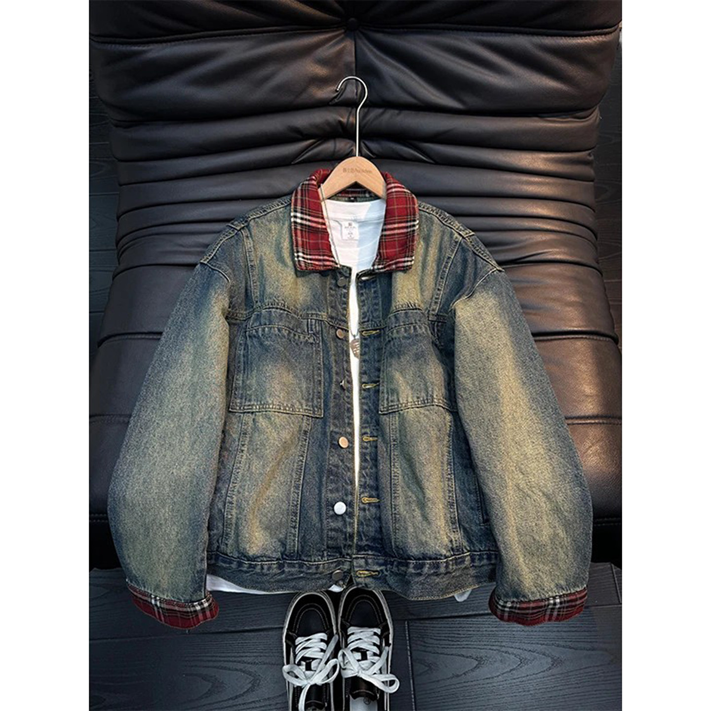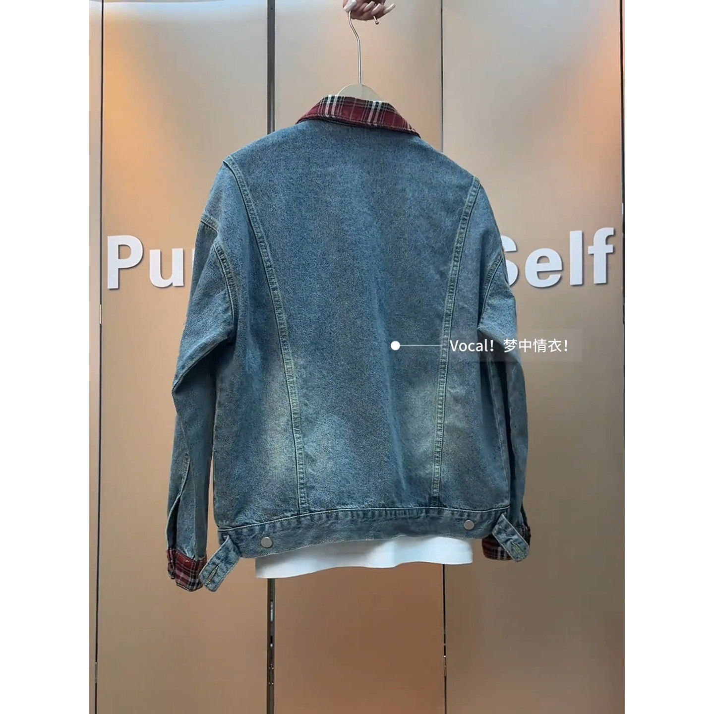 假两件格子翻领牛仔外套男春季美式复古vibe工装夹克重磅水洗上衣