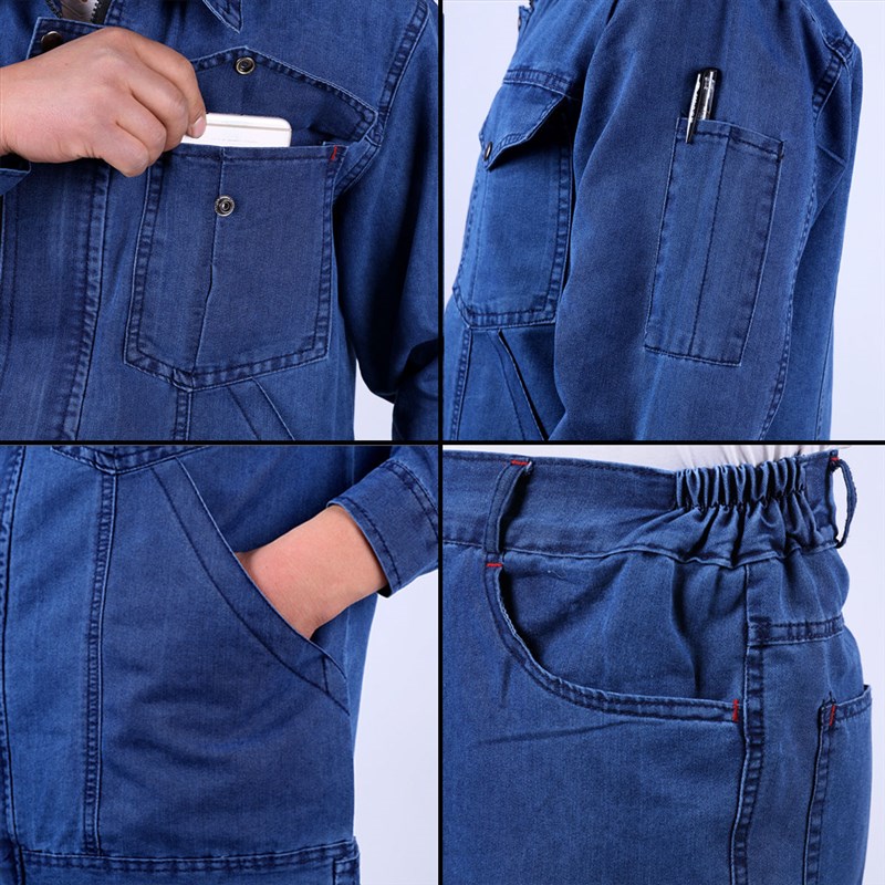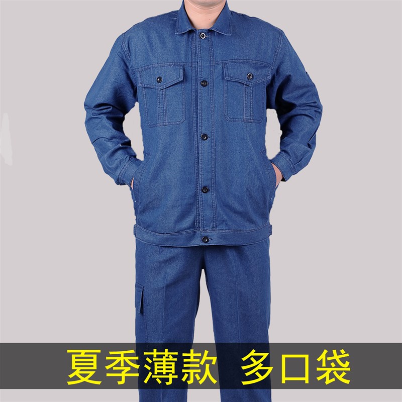 夏季牛仔工作服套装男薄款拉链电焊防烫透气长袖工地劳保工服