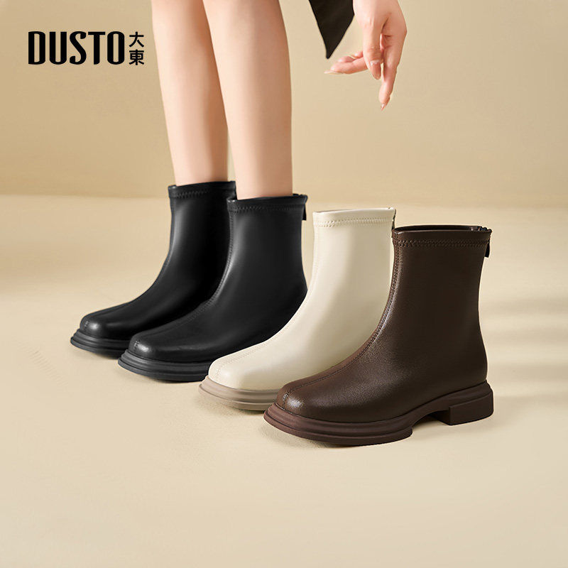 大东时装靴女鞋2025冬季新款时尚休闲粗跟后拉链中跟方头0128Z