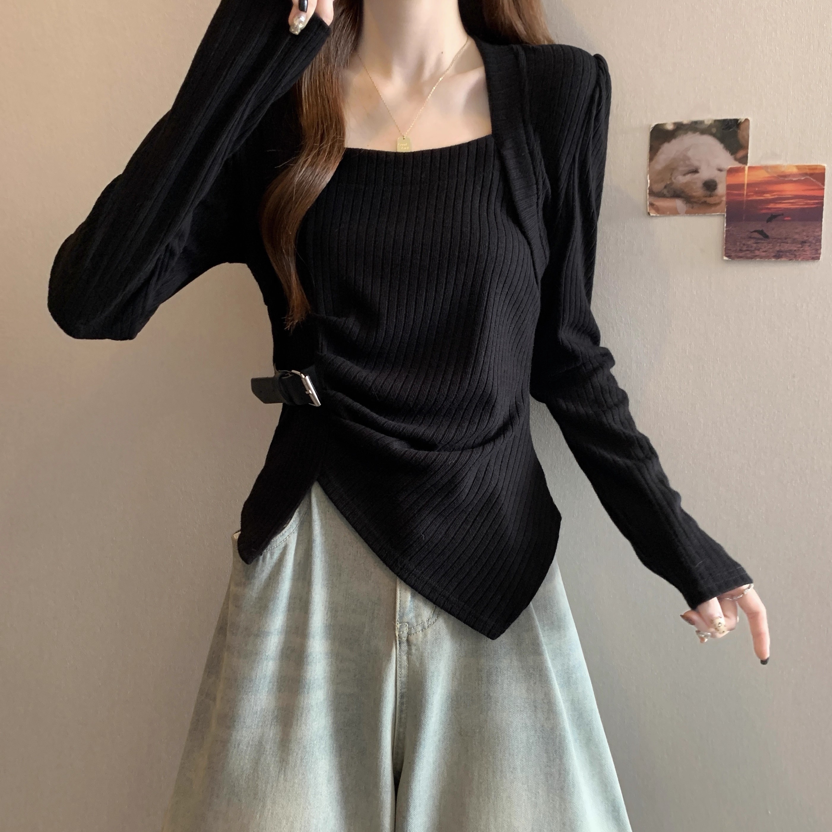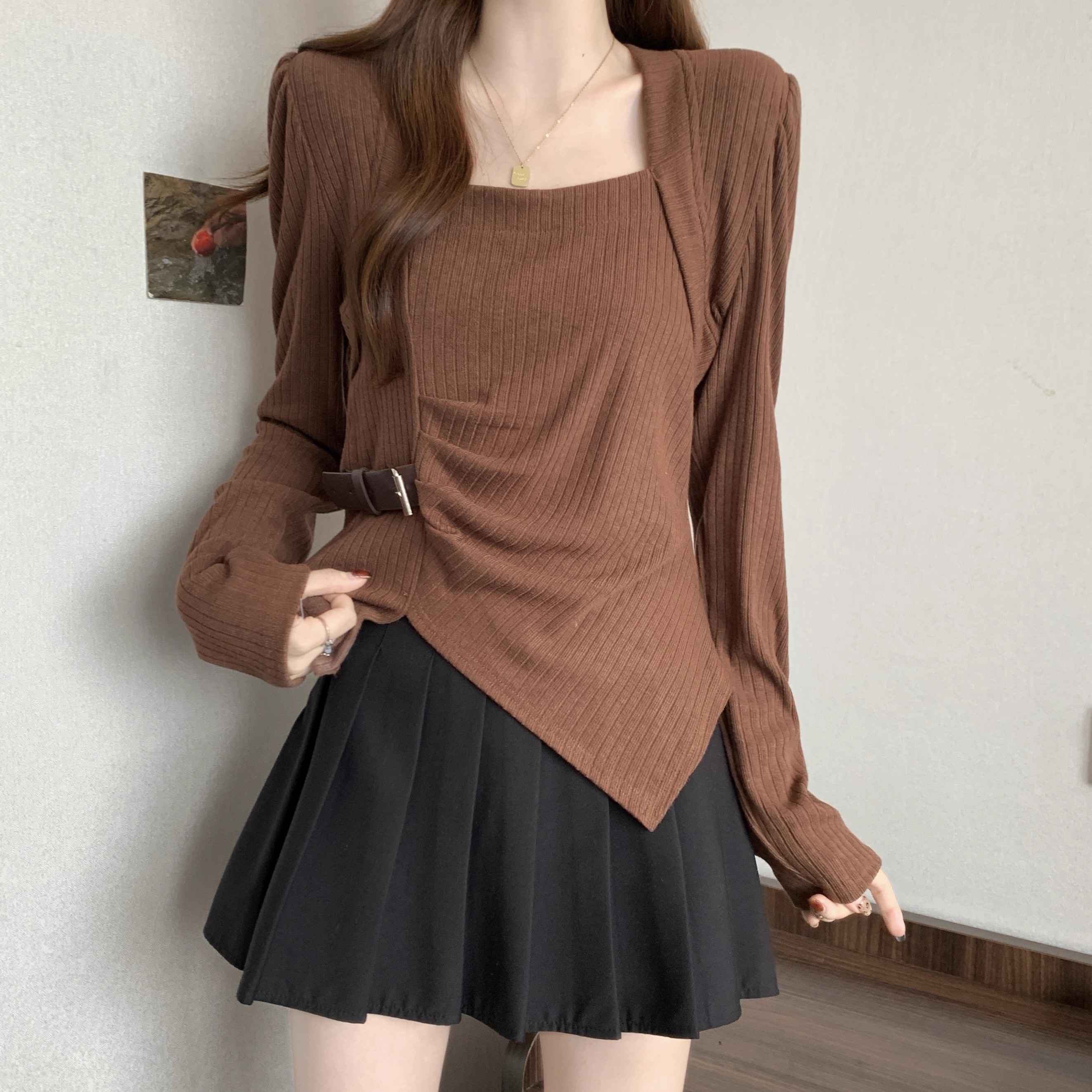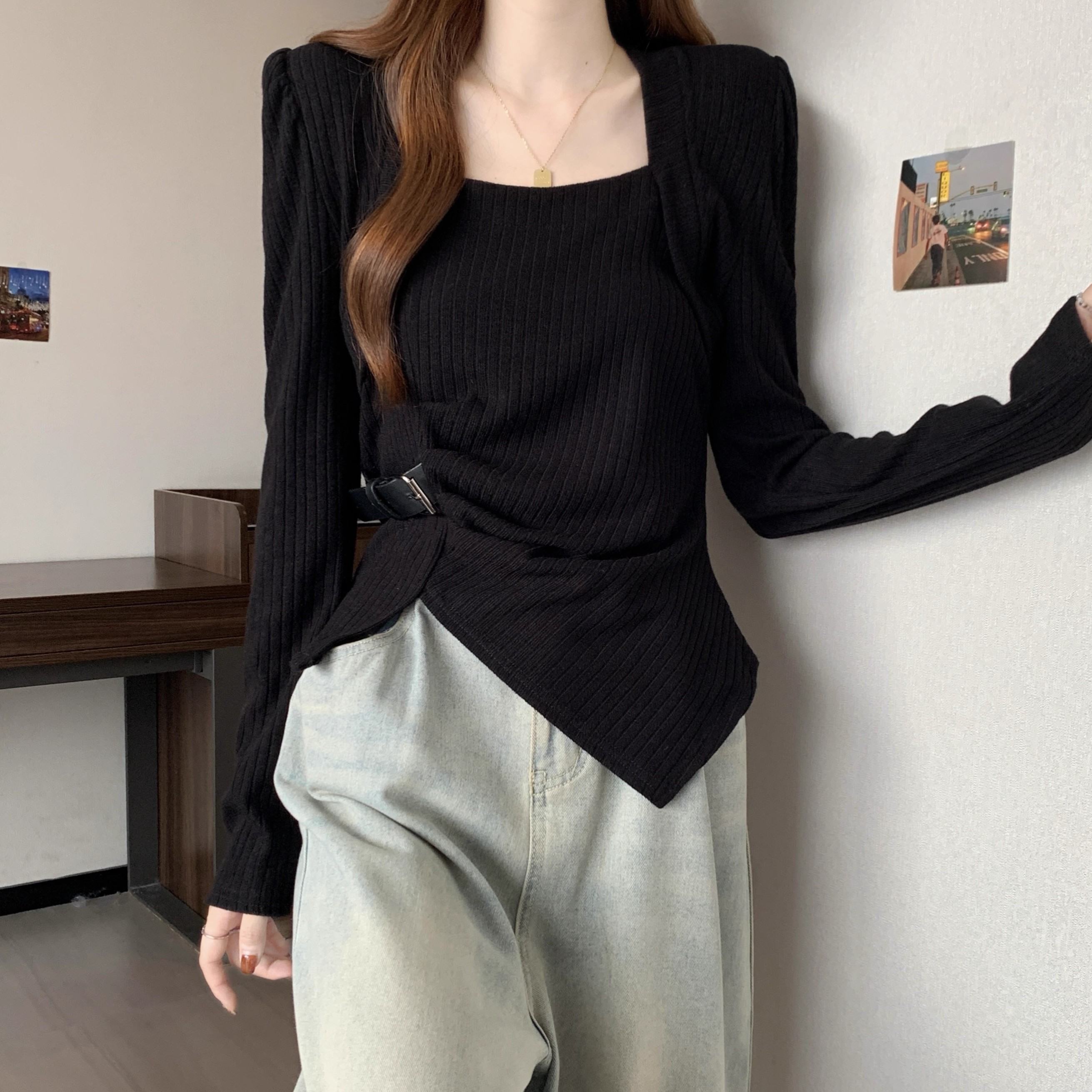 大码方领不规则打底衫长袖T恤女秋冬微胖mm正肩显瘦收腰内搭上衣