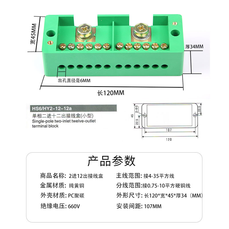 现货速发二进十二出接线端子排铜家用电线分线盒FJ6分线器单相接