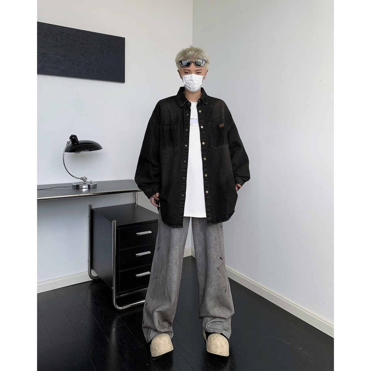 美式潮牌小众复古洗水泥染牛仔衬衫男秋季长袖宽松休闲衬衣外套男