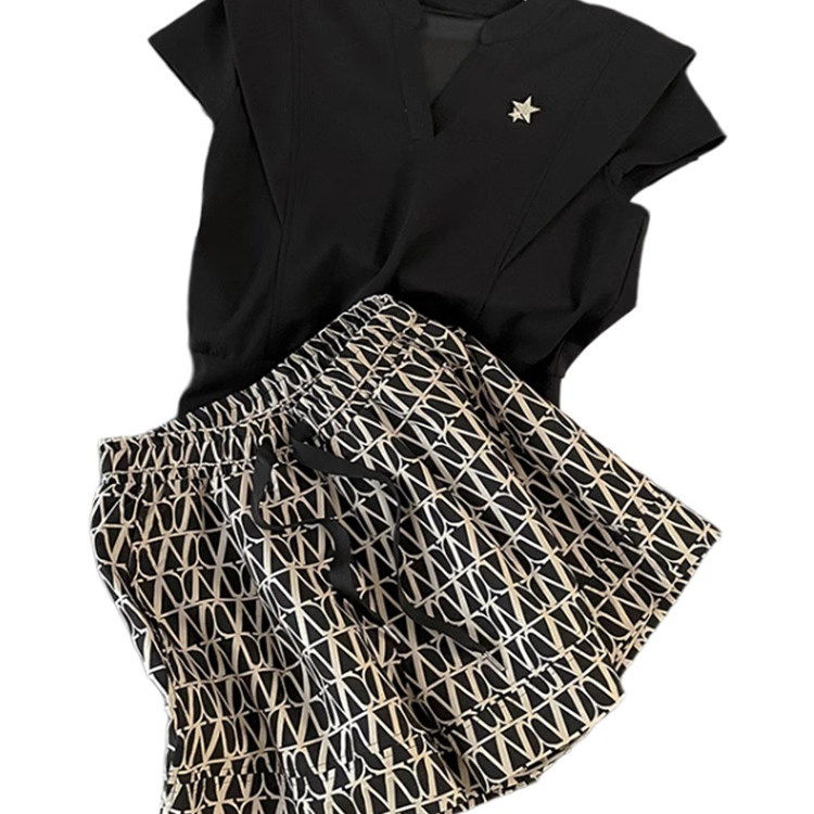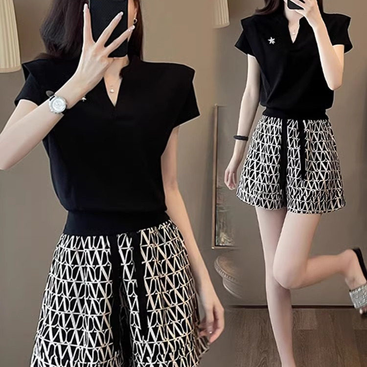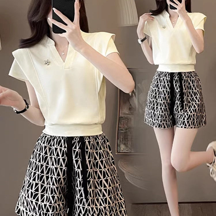 2025夏新款休闲套装女时尚显瘦气质设计感V领短袖上衣短裤两件套