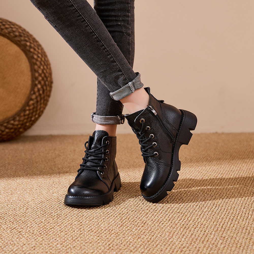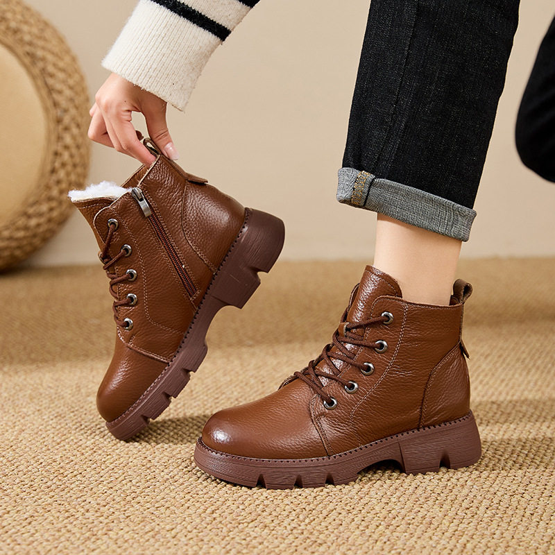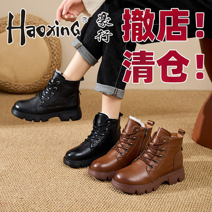 豪行头层牛皮复古马丁靴羊毛厚底短靴橡胶底防滑女靴增高舒适百搭