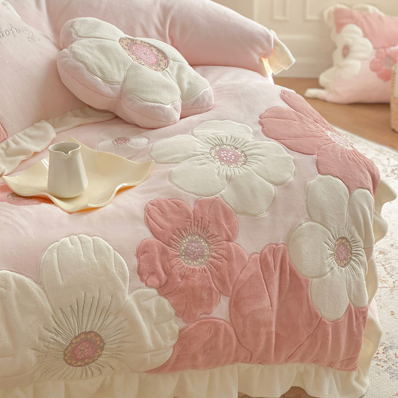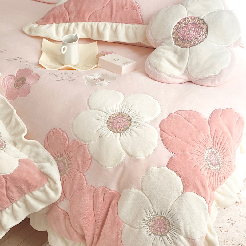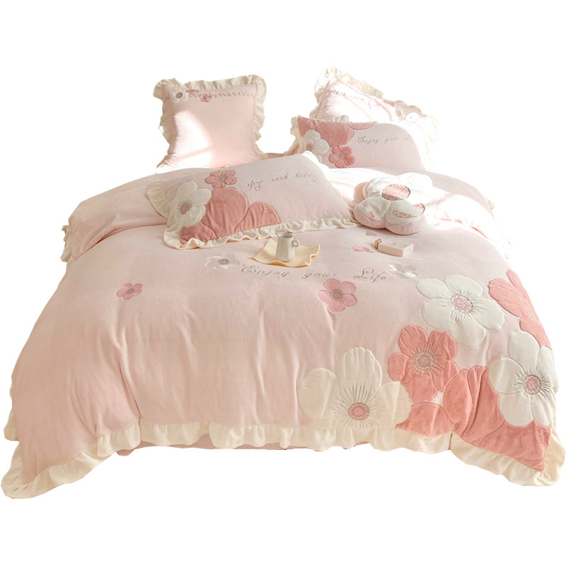 冬季保暖床单公主风牛奶绒四件套双面毛绒加厚珊瑚绒被套刺绣床品